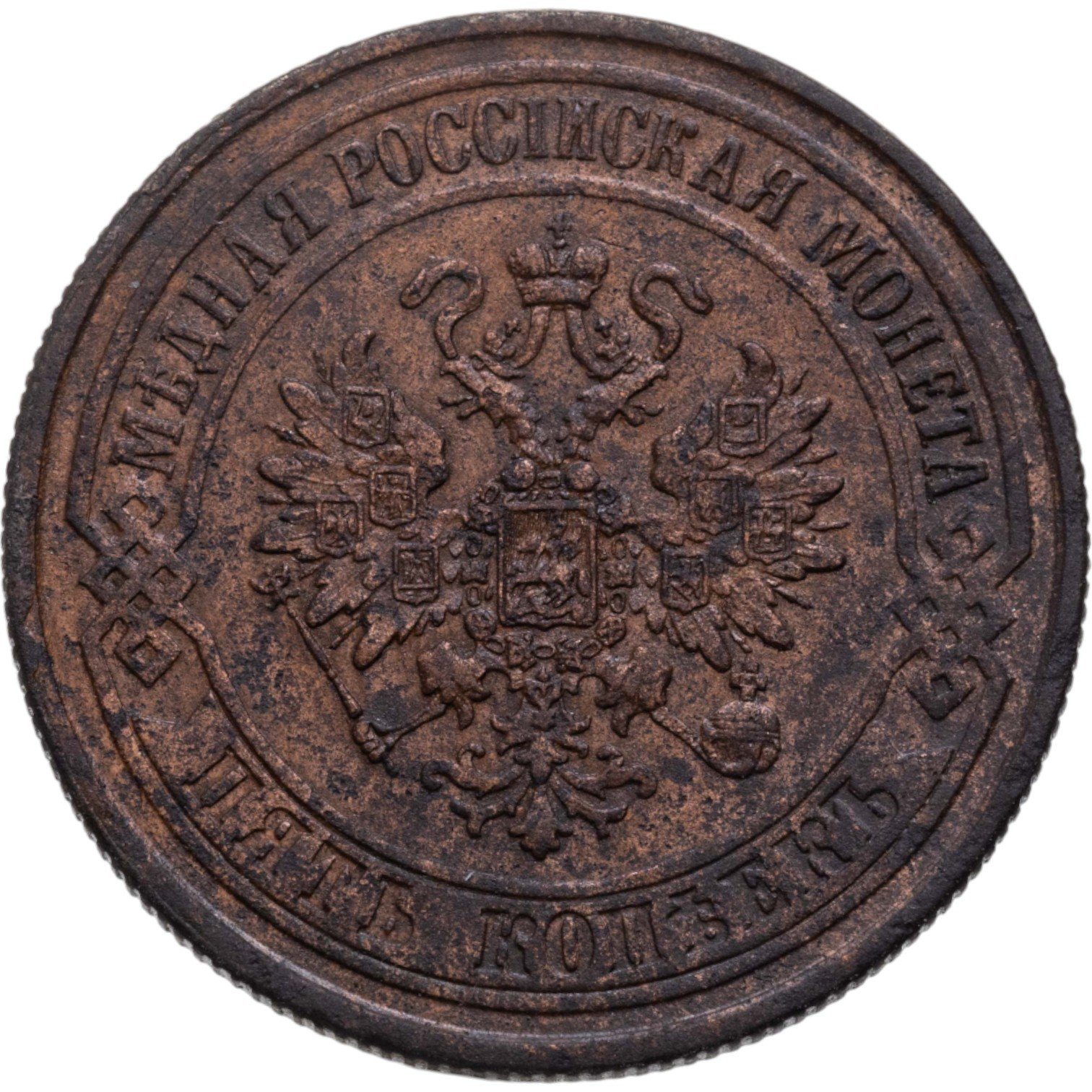 В центре монеты изображен Малый Государственный Герб Российской империи - двуглавый орел, головы которого увенчаны двумя коронами, третья, большая корона над ними. Все они соединены лентой Андрея Первозванного. В правой лапе орла – скипетр, в левой – держава. На его груди расположен Московский герб, в щите изображен Георгий Победоносец с копьем поражающий дракона. Вокруг щита цепь ордена Св. Апостола Андрея Первозванного. На крыльях орла изображены гербы: Царства Казанского, Польского, Херсонеса Таврического, Астраханского, Сибирского, Грузинского и герб соединенных княжеств Киевского, Новгородского и Владимирского — по 4 на каждое крыло. По окружности - две полукруглые плашки, соединенные узорами. На верхней плашке выпуклая надпись: "МЕДНАЯ РОССИЙСКАЯ МОНЕТА". На нижней плашке, изображенной в виде ленты, углубленная надпись: "ПЯТЬ КОПЕЕК".