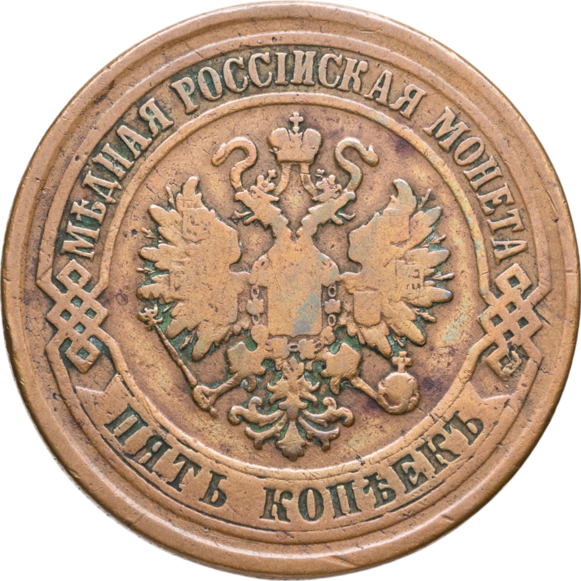 В центре монеты изображен Малый Государственный Герб Российской империи - двуглавый орел, головы которого увенчаны двумя коронами, третья, большая корона над ними. Все они соединены лентой Андрея Первозванного. В правой лапе орла – скипетр, в левой – держава. На его груди расположен Московский герб, в щите изображен Георгий Победоносец с копьем поражающий дракона. Вокруг щита цепь ордена Св. Апостола Андрея Первозванного. На крыльях орла изображены гербы: Царства Казанского, Польского, Херсонеса Таврического, Астраханского, Сибирского, Грузинского и герб соединенных княжеств Киевского, Новгородского и Владимирского — по 4 на каждое крыло. По окружности - две полукруглые плашки, соединенные узорами. На верхней плашке выпуклая надпись: "МЕДНАЯ РОССИЙСКАЯ МОНЕТА". На нижней плашке, изображенной в виде ленты, углубленная надпись: "ПЯТЬ КОПЕЕК".
