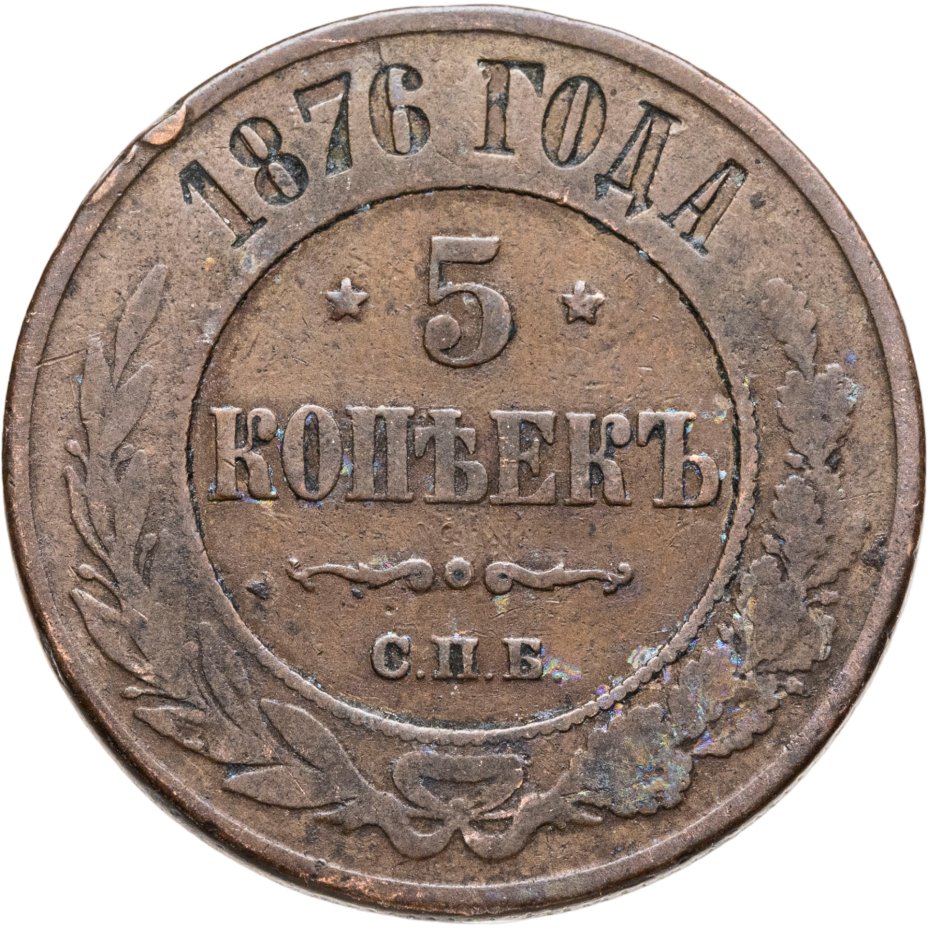 В центре указан номинал «5», ограниченный с обеих сторон звездочками. Под цифрой номинала слово — "КОПЕЕК". Ниже, расположен декоративный разделитель в виде двух изогнутых линий и небольшой окружности между ними. Под линиями обозначение монетного двора «С.П.Б.». Центральная часть отделена от остального изображения, окружностью в виде точек. В верхней части по кругу углубленная надпись: "1876 ГОДА". Вдоль канта изображен венок из лавровой и дубовой ветви, которые в нижней части перевязаны лентой на узел бантом.
