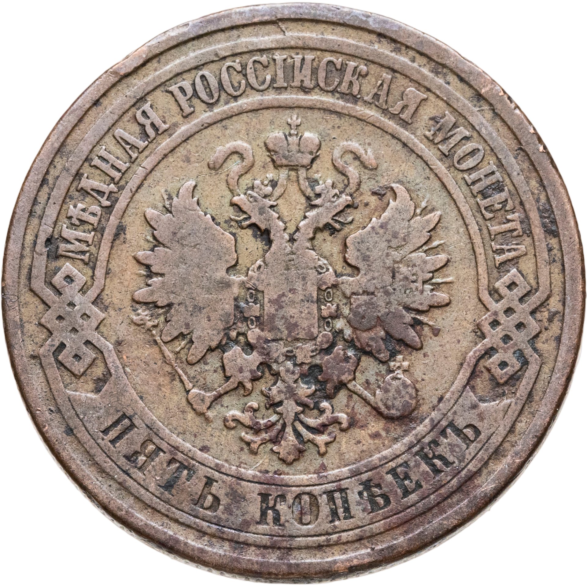 В центре монеты изображен Малый Государственный Герб Российской империи - двуглавый орел, головы которого увенчаны двумя коронами, третья, большая корона над ними. Все они соединены лентой Андрея Первозванного. В правой лапе орла – скипетр, в левой – держава. На его груди расположен Московский герб, в щите изображен Георгий Победоносец с копьем поражающий дракона. Вокруг щита цепь ордена Св. Апостола Андрея Первозванного. На крыльях орла изображены гербы: Царства Казанского, Польского, Херсонеса Таврического, Астраханского, Сибирского, Грузинского и герб соединенных княжеств Киевского, Новгородского и Владимирского — по 4 на каждое крыло. По окружности - две полукруглые плашки, соединенные узорами. На верхней плашке выпуклая надпись: "МЕДНАЯ РОССИЙСКАЯ МОНЕТА". На нижней плашке, изображенной в виде ленты, углубленная надпись: "ПЯТЬ КОПЕЕК".