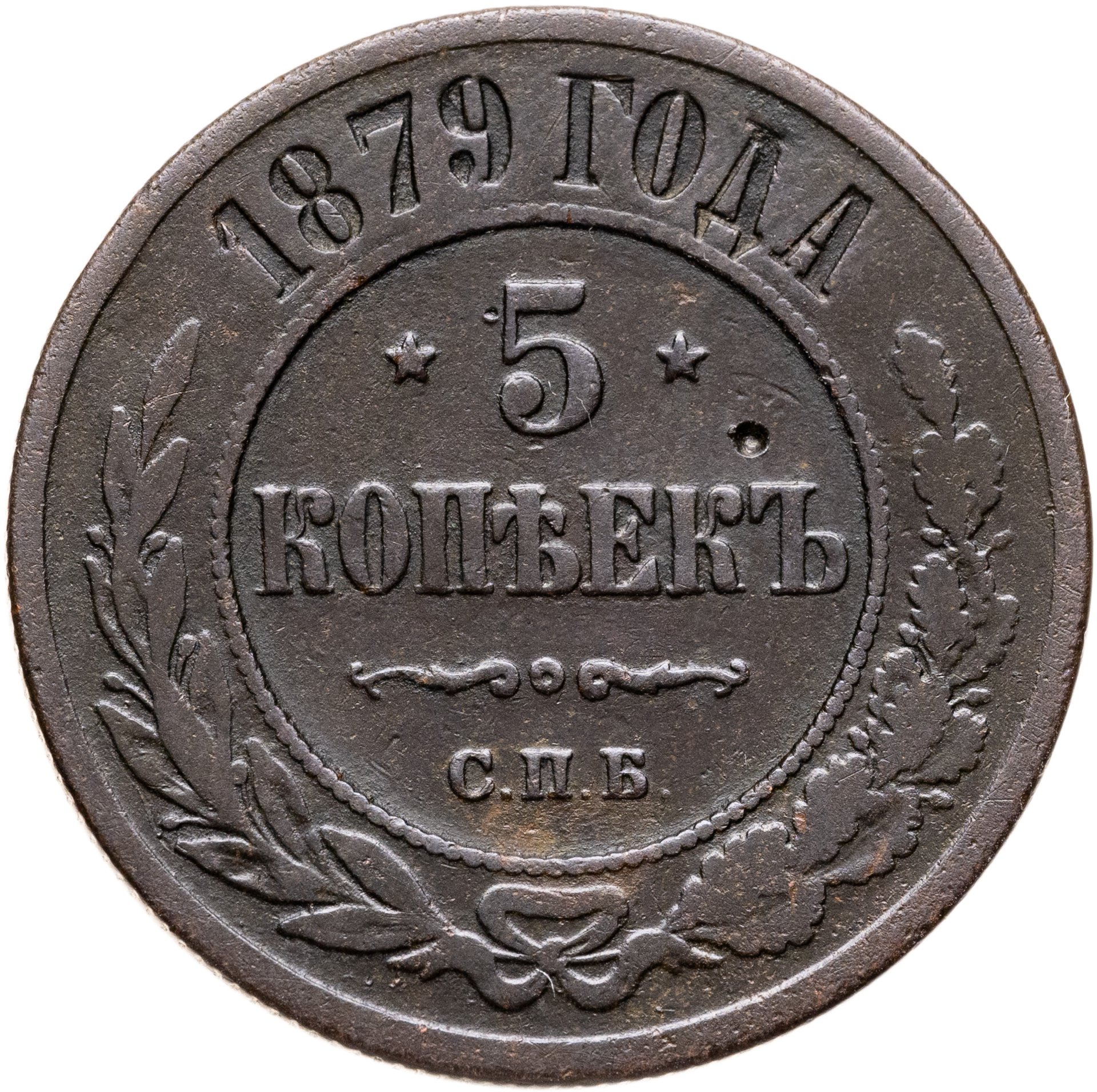 В центре указан номинал «5», ограниченный с обеих сторон звездочками. Под цифрой номинала слово — "КОПЕЕК". Ниже, расположен декоративный разделитель в виде двух изогнутых линий и небольшой окружности между ними. Под линиями обозначение монетного двора «С.П.Б.». Центральная часть отделена от остального изображения, окружностью в виде точек. В верхней части по кругу углубленная надпись: "1879 ГОДА". Вдоль канта изображен венок из лавровой и дубовой ветви, которые в нижней части перевязаны лентой на узел бантом.