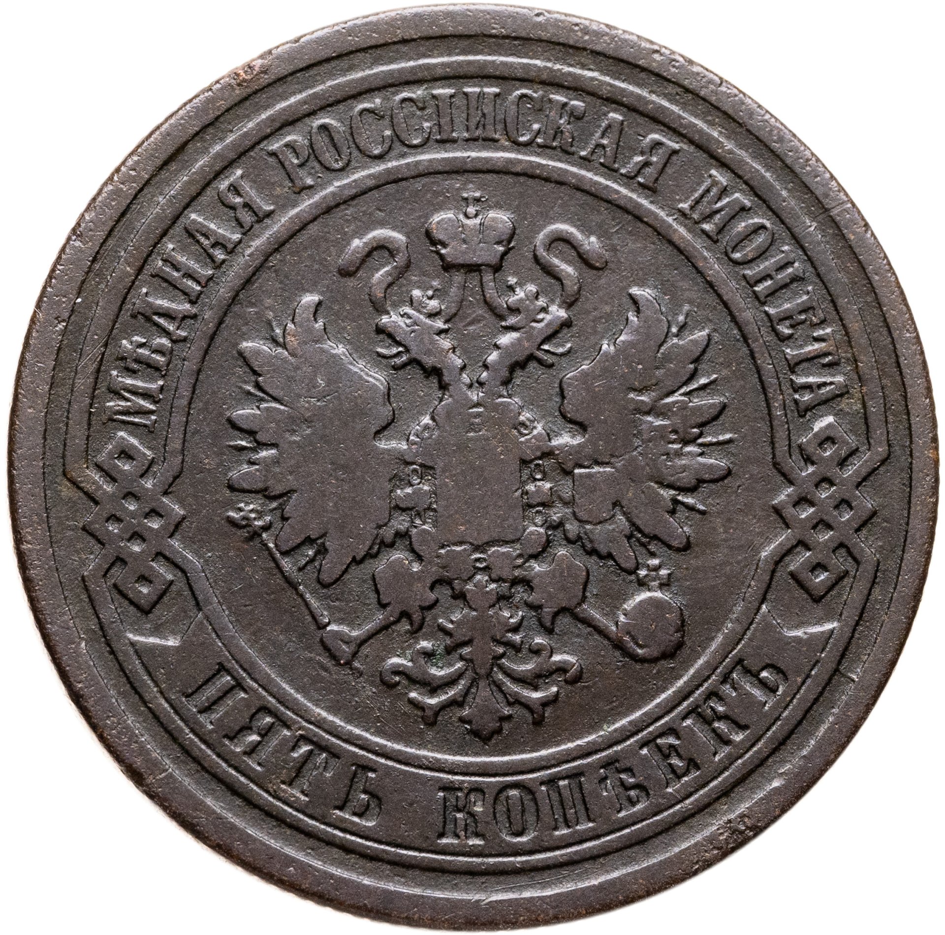 В центре монеты изображен Малый Государственный Герб Российской империи - двуглавый орел, головы которого увенчаны двумя коронами, третья, большая корона над ними. Все они соединены лентой Андрея Первозванного. В правой лапе орла – скипетр, в левой – держава. На его груди расположен Московский герб, в щите изображен Георгий Победоносец с копьем поражающий дракона. Вокруг щита цепь ордена Св. Апостола Андрея Первозванного. На крыльях орла изображены гербы: Царства Казанского, Польского, Херсонеса Таврического, Астраханского, Сибирского, Грузинского и герб соединенных княжеств Киевского, Новгородского и Владимирского — по 4 на каждое крыло. По окружности - две полукруглые плашки, соединенные узорами. На верхней плашке выпуклая надпись: "МЕДНАЯ РОССИЙСКАЯ МОНЕТА". На нижней плашке, изображенной в виде ленты, углубленная надпись: "ПЯТЬ КОПЕЕК".