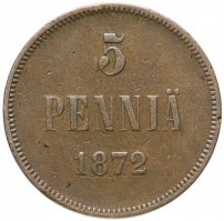 В центре надпись в три строки: «5»│«PENNIÄ»│«1872». По окружности канта имеются рельефные элементы, выполненные в виде точек.