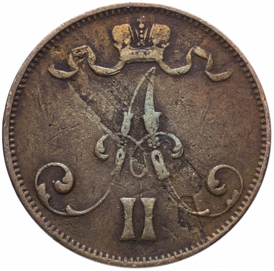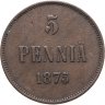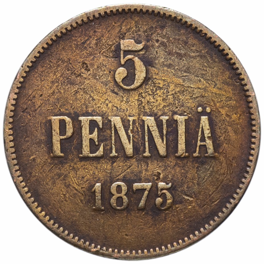 В центре надпись в три строки: «5»│«PENNIÄ»│«1875». По окружности канта имеются рельефные элементы, выполненные в виде точек.