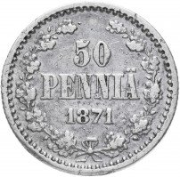 В центре - надпись в три строки: «50»│«PENNIÄ»│«1871». Вдоль канта изображён не замкнутый венок из двух дубовых ветвей, которые, в нижней части, перевязаны лентой на узел двойным бантом. По окружности канта имеются рельефные элементы, выполненные в виде зубцов.