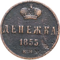 В центе обозначение номинала — слово «ДЕНЕЖКА». Выше номинала - Корона Российской империи. Ниже номинала — год выпуска монеты «1855.» и под годом — обозначение монетного двора буквы «Е.М.».