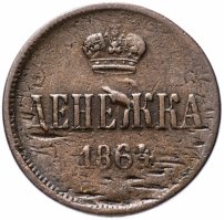 В центе обозначение номинала - слово «ДЕНЕЖКА». Выше - Корона Российской империи. Ниже - год выпуска монеты «1864.» и под годом - обозначение монетного двора буквы «Е.М.».