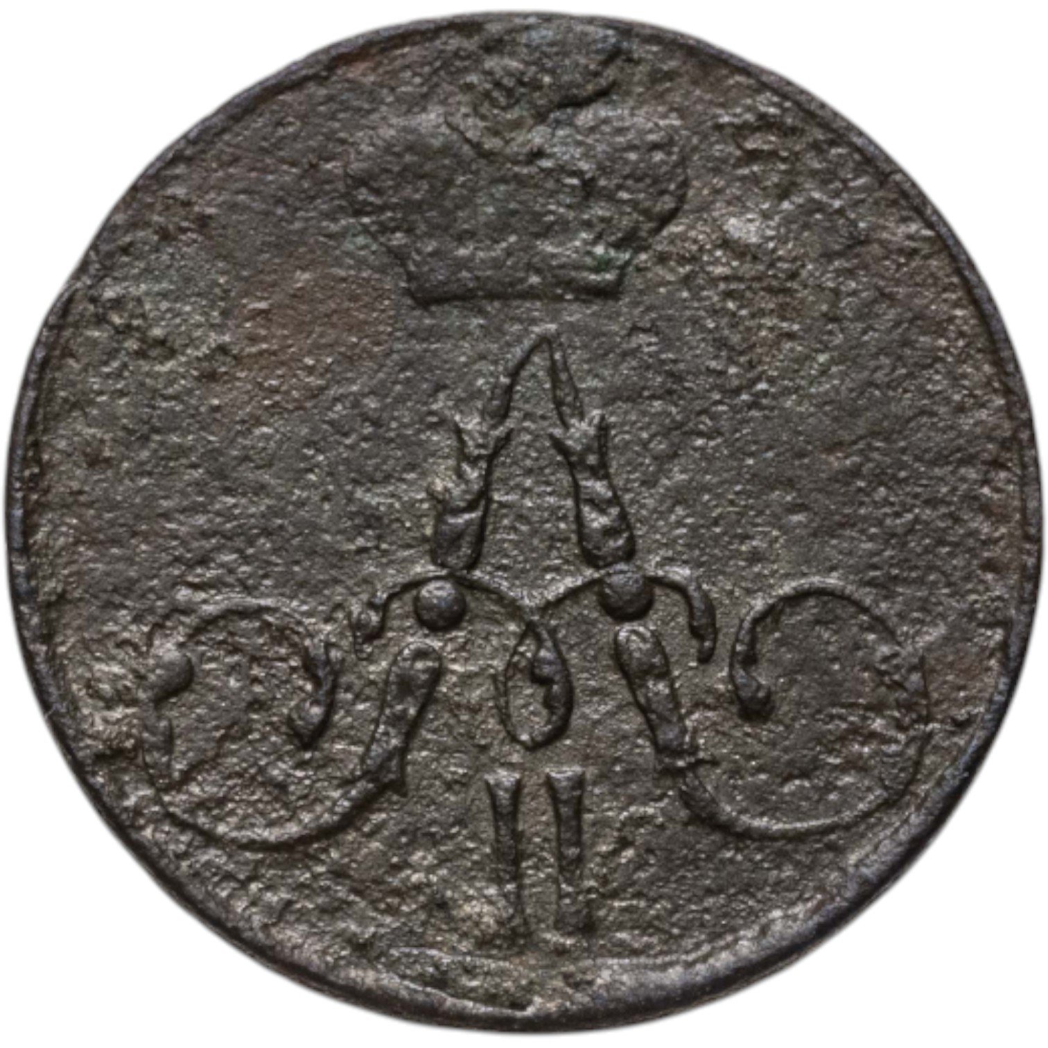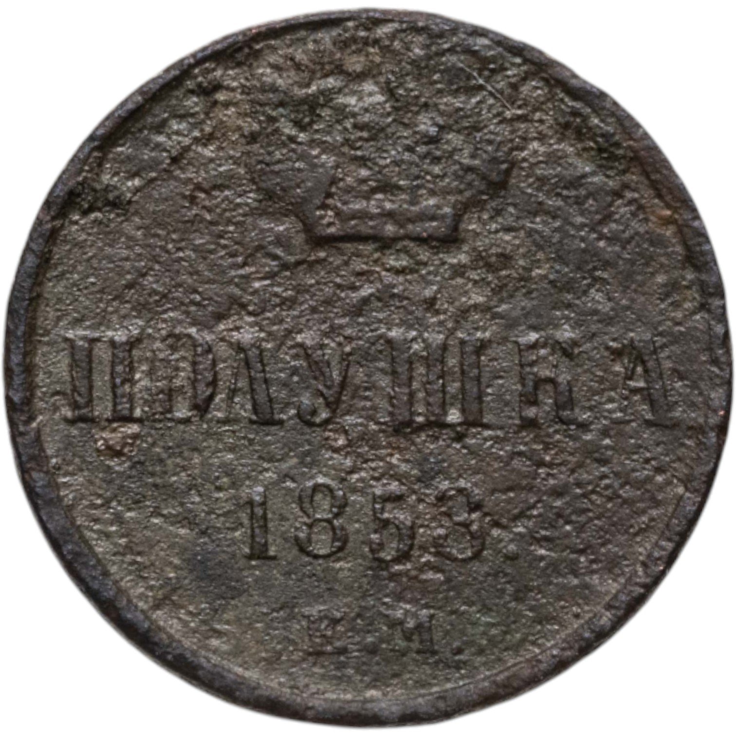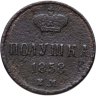 В центе обозначение номинала — слово «ПОЛУШКА». Выше номинала — Корона Российской империи. Ниже номинала — год выпуска монеты «1858.» и под годом — обозначение монетного двора буквы «Е.М.».