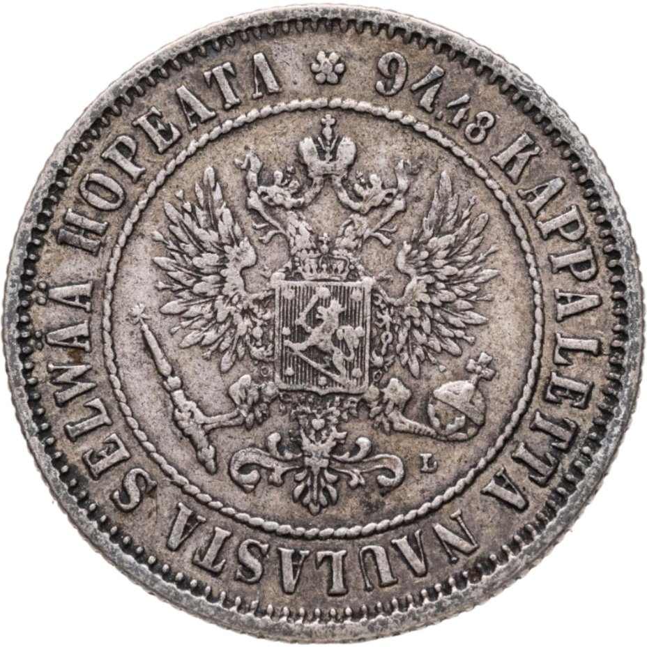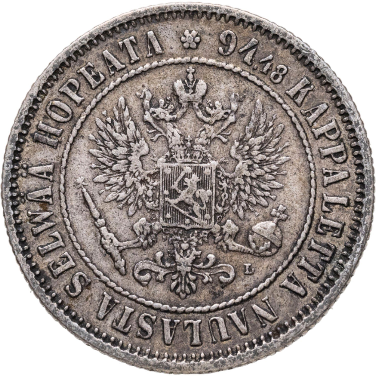 В центре изображён полный Герб Великого княжества Финляндского - двуглавый орёл, головы которого увенчаны двумя коронами, третья, большая корона над ними. Все они соединены орденской лентой ордена Св. Апостола Андрея Первозванного. На груди орла расположен щит с титульным гербом Великого князя Финляндского, увенчанный княжеской короной. Вокруг щита орденская цепь с орденом Св. Апостола Андрея Первозванного. В правой лапе орла – скипетр, в левой – держава. Под левой лапой знак директора Гельсингфосского монетного двора - литера «L», Johan Conrad Lihr (Йохан Конрад Лир). Вокруг центрального изображения - витой ободок. За ободком круговая надпись: «94.48 KAPPALETTA NAULASTA SELWÄÄ HOPEATA», сверху разделённая цветочной розеткой. По окружности канта имеются рельефные элементы, выполненные в виде зубцов.