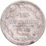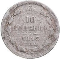 В центре указан номинал «10», ограниченный с обеих сторон шестиконечными звездочками. Над цифрой – Корона Российской империи. Под цифрой номинала — слово "КОПЕЕК". Ниже, расположен декоративный разделитель в виде двух разнонаправленных фигурных линий и стилизованным из точек крестом между ними. Под разделителем — дата выпуска монеты «1893». Под цифрой даты — обозначение монетного двора «С.П.Б.». Вдоль канта, не доходя до короны, изображен венок из лавровой и дубовой ветви, которые в нижней части перевязаны лентой на узел бантом. По окружности канта имеются рельефные элементы, выполненные в виде зубцов.