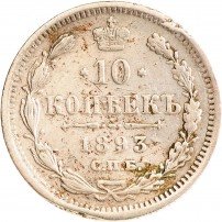 В центре указан номинал «10», ограниченный с обеих сторон шестиконечными звездочками. Над цифрой – Корона Российской империи. Под цифрой номинала — слово "КОПЕЕК". Ниже, расположен декоративный разделитель в виде двух разнонаправленных фигурных линий и стилизованным из точек крестом между ними. Под разделителем — дата выпуска монеты «1893». Под цифрой даты — обозначение монетного двора «С.П.Б.». Вдоль канта, не доходя до короны, изображен венок из лавровой и дубовой ветви, которые в нижней части перевязаны лентой на узел бантом. По окружности канта имеются рельефные элементы, выполненные в виде зубцов.