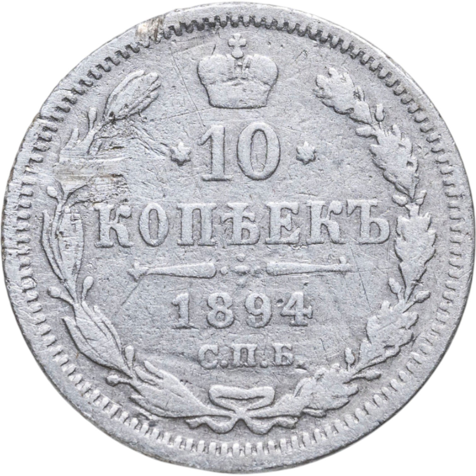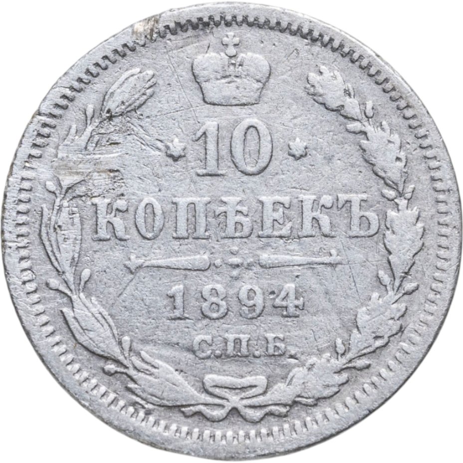 В центре указан номинал «10», ограниченный с обеих сторон шестиконечными звездочками. Над цифрой – Корона Российской империи. Под цифрой номинала — слово "КОПЕЕК". Ниже, расположен декоративный разделитель в виде двух разнонаправленных фигурных линий и стилизованным из точек крестом между ними. Под разделителем — дата выпуска монеты «1894». Под цифрой даты — обозначение монетного двора «С.П.Б.». Вдоль канта, не доходя до короны, изображен венок из лавровой и дубовой ветви, которые в нижней части перевязаны лентой на узел бантом. По окружности канта имеются рельефные элементы, выполненные в виде зубцов.