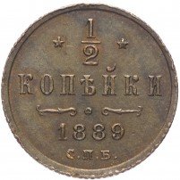 В центре указан номинал «1/2», ограниченный с обеих сторон звездочками. Под цифрой номинала слово — "КОПЕЙКИ". Ниже, расположен декоративный разделитель в виде двух изогнутых линий и небольшой окружности между ними. Под линиями год выпуска монеты "1889" и под ним обозначение монетного двора «С.П.Б.».