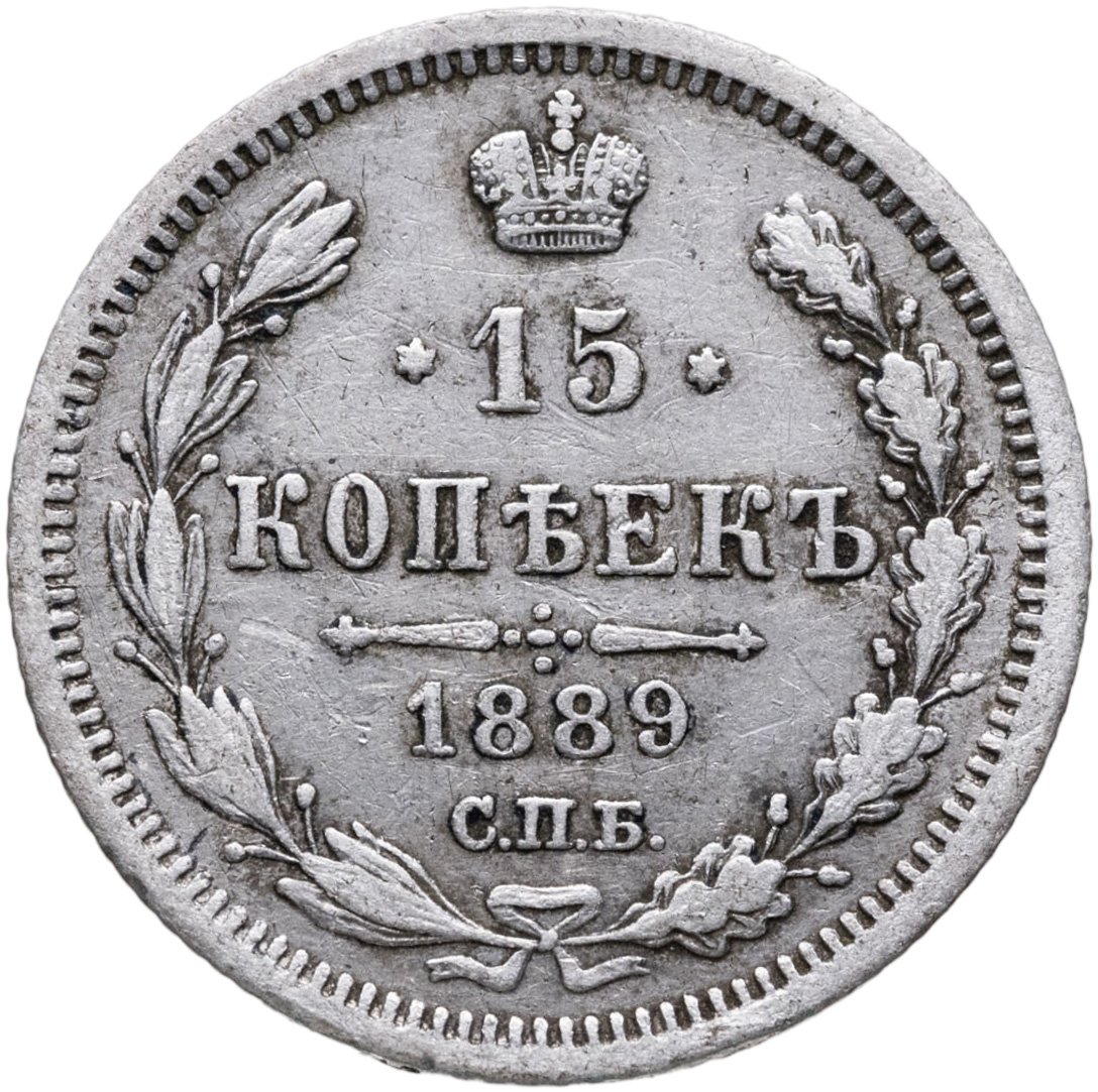 В центре указан номинал «15», ограниченный с обеих сторон шестиконечными звездочками. Над цифрой – Корона Российской империи. Под цифрой номинала — слово "КОПЕЕК". Ниже, расположен декоративный разделитель в виде двух разнонаправленных фигурных линий и стилизованным из точек крестом между ними. Под разделителем — дата выпуска монеты «1889». Под цифрой даты — обозначение монетного двора «С.П.Б.». Вдоль канта, не доходя до короны, изображен венок из лавровой и дубовой ветви, которые в нижней части перевязаны лентой на узел бантом. По окружности канта имеются рельефные элементы, выполненные в виде зубцов.
