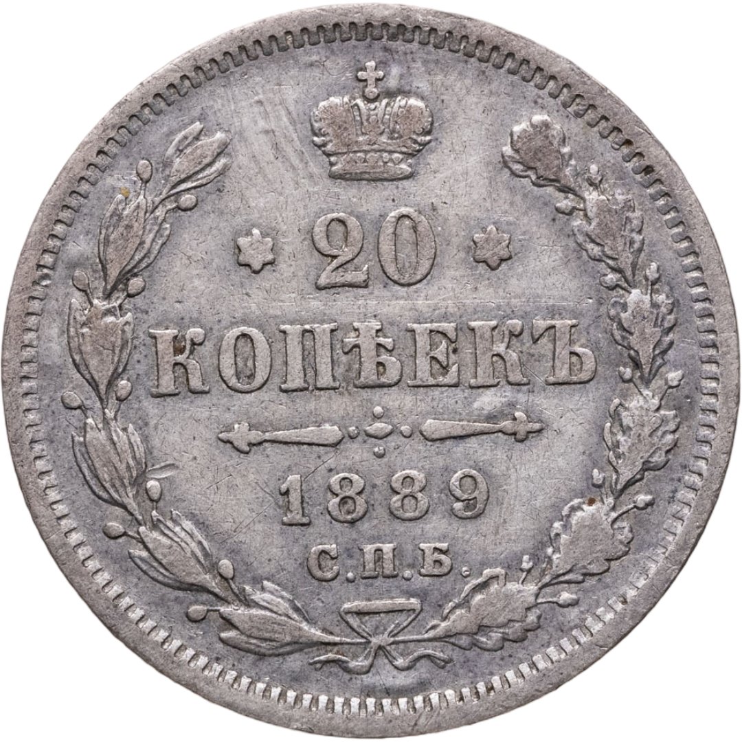 В центре указан номинал «20», ограниченный с обеих сторон шестиконечными звездочками. Над цифрой – Корона Российской империи. Под цифрой номинала — слово "КОПЕЕК". Ниже, расположен декоративный разделитель в виде двух разнонаправленных фигурных линий и стилизованным из точек крестом между ними. Под разделителем — дата выпуска монеты «1889». Под цифрой даты — обозначение монетного двора «С.П.Б.». Вдоль канта, не доходя до короны, изображен венок из лавровой и дубовой ветви, которые в нижней части перевязаны лентой на узел бантом. По окружности канта имеются рельефные элементы, выполненные в виде зубцов.