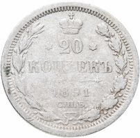В центре указан номинал «20», ограниченный с обеих сторон шестиконечными звездочками. Над цифрой – Корона Российской империи. Под цифрой номинала — слово "КОПЕЕК". Ниже, расположен декоративный разделитель в виде двух разнонаправленных фигурных линий и стилизованным из точек крестом между ними. Под разделителем — дата выпуска монеты «1891». Под цифрой даты — обозначение монетного двора «С.П.Б.». Вдоль канта, не доходя до короны, изображен венок из лавровой и дубовой ветви, которые в нижней части перевязаны лентой на узел бантом. По окружности канта имеются рельефные элементы, выполненные в виде зубцов.