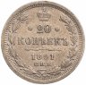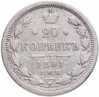 В центре указан номинал «20», ограниченный с обеих сторон шестиконечными звездочками. Над цифрой – Корона Российской империи. Под цифрой номинала — слово "КОПЕЕК". Ниже, расположен декоративный разделитель в виде двух разнонаправленных фигурных линий и стилизованным из точек крестом между ними. Под разделителем — дата выпуска монеты «1891». Под цифрой даты — обозначение монетного двора «С.П.Б.». Вдоль канта, не доходя до короны, изображен венок из лавровой и дубовой ветви, которые в нижней части перевязаны лентой на узел бантом. По окружности канта имеются рельефные элементы, выполненные в виде зубцов.