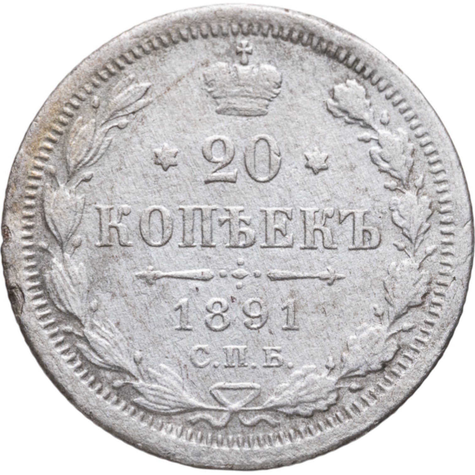 В центре указан номинал «20», ограниченный с обеих сторон шестиконечными звездочками. Над цифрой – Корона Российской империи. Под цифрой номинала — слово "КОПЕЕК". Ниже, расположен декоративный разделитель в виде двух разнонаправленных фигурных линий и стилизованным из точек крестом между ними. Под разделителем — дата выпуска монеты «1891». Под цифрой даты — обозначение монетного двора «С.П.Б.». Вдоль канта, не доходя до короны, изображен венок из лавровой и дубовой ветви, которые в нижней части перевязаны лентой на узел бантом. По окружности канта имеются рельефные элементы, выполненные в виде зубцов.
