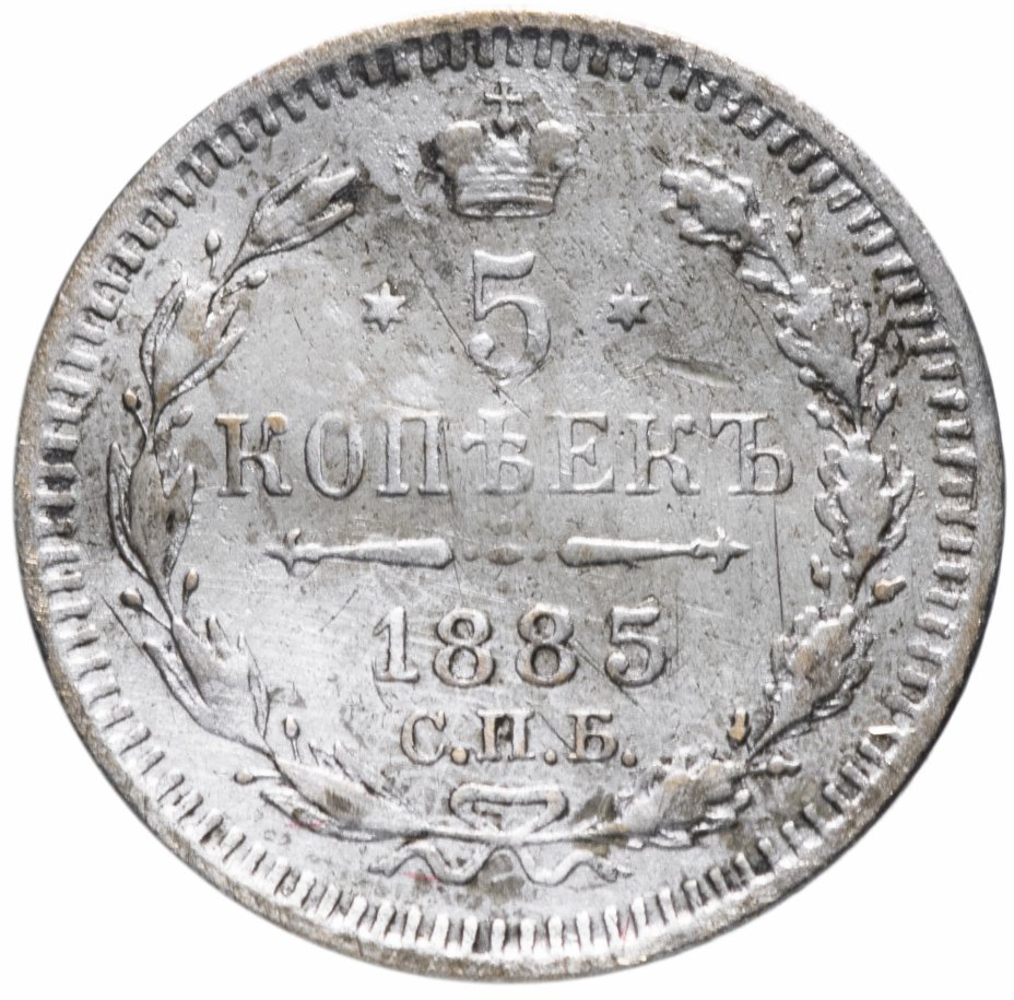 В центре указан номинал «5», ограниченный с обеих сторон шестиконечными звездочками. Над цифрой – Корона Российской империи. Под цифрой номинала — слово "КОПЕЕК". Ниже, расположен декоративный разделитель в виде двух разнонаправленных фигурных линий и стилизованным из точек крестом между ними. Под разделителем — дата выпуска монеты «1885». Под цифрой даты — обозначение монетного двора «С.П.Б.». Вдоль канта, не доходя до короны, изображен венок из лавровой и дубовой ветви, которые в нижней части перевязаны лентой на узел бантом. По окружности канта имеются рельефные элементы, выполненные в виде зубцов.