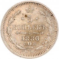 В центре указан номинал «5», ограниченный с обеих сторон шестиконечными звездочками. Над цифрой – Корона Российской империи. Под цифрой номинала — слово "КОПЕЕК". Ниже, расположен декоративный разделитель в виде двух разнонаправленных фигурных линий и стилизованным из точек крестом между ними. Под разделителем — дата выпуска монеты «1886». Под цифрой даты — обозначение монетного двора «С.П.Б.». Вдоль канта, не доходя до короны, изображен венок из лавровой и дубовой ветви, которые в нижней части перевязаны лентой на узел бантом. По окружности канта имеются рельефные элементы, выполненные в виде зубцов.