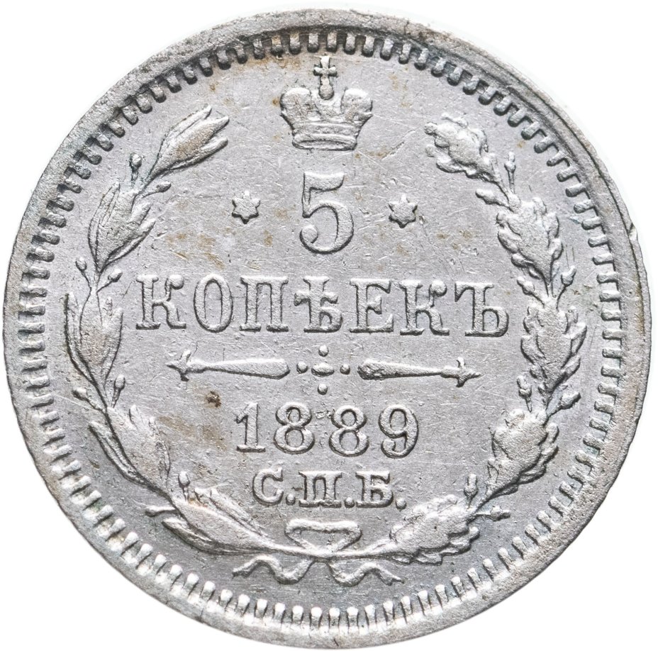 В центре указан номинал «5», ограниченный с обеих сторон шестиконечными звездочками. Над цифрой – Корона Российской империи. Под цифрой номинала — слово "КОПЕЕК". Ниже, расположен декоративный разделитель в виде двух разнонаправленных фигурных линий и стилизованным из точек крестом между ними. Под разделителем — дата выпуска монеты «1889». Под цифрой даты — обозначение монетного двора «С.П.Б.». Вдоль канта, не доходя до короны, изображен венок из лавровой и дубовой ветви, которые в нижней части перевязаны лентой на узел бантом. По окружности канта имеются рельефные элементы, выполненные в виде зубцов.