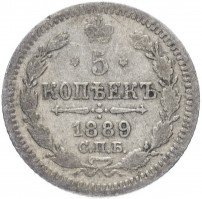 В центре указан номинал «5», ограниченный с обеих сторон шестиконечными звездочками. Над цифрой – Корона Российской империи. Под цифрой номинала — слово "КОПЕЕК". Ниже, расположен декоративный разделитель в виде двух разнонаправленных фигурных линий и стилизованным из точек крестом между ними. Под разделителем — дата выпуска монеты «1889». Под цифрой даты — обозначение монетного двора «С.П.Б.». Вдоль канта, не доходя до короны, изображен венок из лавровой и дубовой ветви, которые в нижней части перевязаны лентой на узел бантом. По окружности канта имеются рельефные элементы, выполненные в виде зубцов.