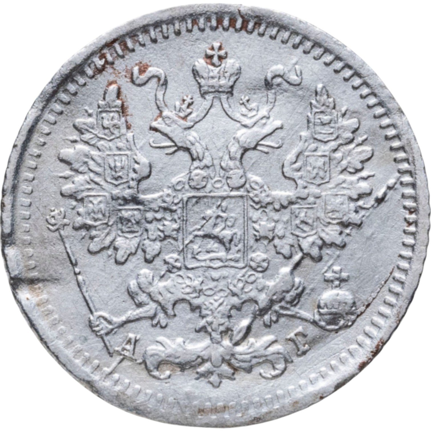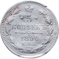 В центре указан номинал «5», ограниченный с обеих сторон шестиконечными звездочками. Над цифрой – Корона Российской империи. Под цифрой номинала — слово "КОПЕЕК". Ниже, расположен декоративный разделитель в виде двух разнонаправленных фигурных линий и стилизованным из точек крестом между ними. Под разделителем — дата выпуска монеты «1890». Под цифрой даты — обозначение монетного двора «С.П.Б.». Вдоль канта, не доходя до короны, изображен венок из лавровой и дубовой ветви, которые в нижней части перевязаны лентой на узел бантом. По окружности канта имеются рельефные элементы, выполненные в виде зубцов.