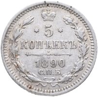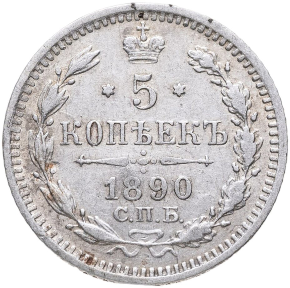В центре указан номинал «5», ограниченный с обеих сторон шестиконечными звездочками. Над цифрой – Корона Российской империи. Под цифрой номинала — слово "КОПЕЕК". Ниже, расположен декоративный разделитель в виде двух разнонаправленных фигурных линий и стилизованным из точек крестом между ними. Под разделителем — дата выпуска монеты «1890». Под цифрой даты — обозначение монетного двора «С.П.Б.». Вдоль канта, не доходя до короны, изображен венок из лавровой и дубовой ветви, которые в нижней части перевязаны лентой на узел бантом. По окружности канта имеются рельефные элементы, выполненные в виде зубцов.