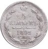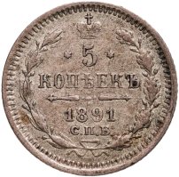В центре указан номинал «5», ограниченный с обеих сторон шестиконечными звездочками. Над цифрой – Корона Российской империи. Под цифрой номинала — слово "КОПЕЕК". Ниже, расположен декоративный разделитель в виде двух разнонаправленных фигурных линий и стилизованным из точек крестом между ними. Под разделителем — дата выпуска монеты «1891». Под цифрой даты — обозначение монетного двора «С.П.Б.». Вдоль канта, не доходя до короны, изображен венок из лавровой и дубовой ветви, которые в нижней части перевязаны лентой на узел бантом. По окружности канта имеются рельефные элементы, выполненные в виде зубцов.