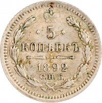 В центре указан номинал «5», ограниченный с обеих сторон шестиконечными звездочками. Над цифрой – Корона Российской империи. Под цифрой номинала — слово "КОПЕЕК". Ниже, расположен декоративный разделитель в виде двух разнонаправленных фигурных линий и стилизованным из точек крестом между ними. Под разделителем — дата выпуска монеты «1892». Под цифрой даты — обозначение монетного двора «С.П.Б.». Вдоль канта, не доходя до короны, изображен венок из лавровой и дубовой ветви, которые в нижней части перевязаны лентой на узел бантом. По окружности канта имеются рельефные элементы, выполненные в виде зубцов.