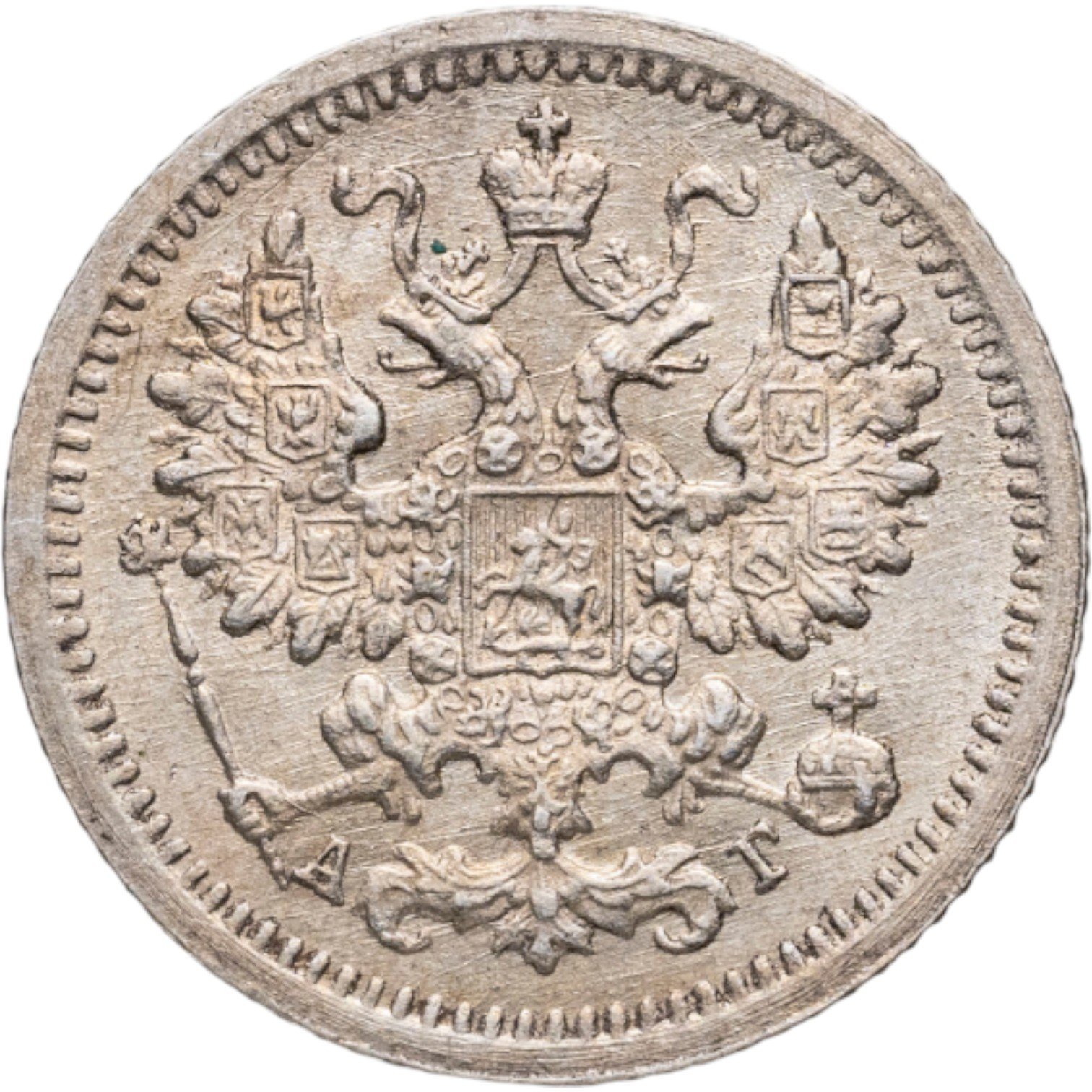 В центре изображен Малый Государственный Герб Российской империи - двуглавый орёл, головы которого увенчаны двумя коронами, третья, большая корона над ними. Все они соединены орденской лентой ордена Св. Апостола Андрея Первозванного. На груди орла расположен Московский герб, в щите изображен Георгий Победоносец с копьем поражающий дракона. Вокруг щита цепь ордена Св. Апостола Андрея Первозванного. На крыльях изображены гербы: Царства Казанского, Польского, Херсонеса Таврического, Астраханского, Сибирского, Грузинского и герб соединенных княжеств Киевского, Новгородского и Владимирского — по 4 на каждое крыло. В правой лапе орла – скипетр, в левой – держава. Под правой лапой – буква «А», под левой – буква «Г». Инициалы минцмейстера Аполлона Грасгофа. По окружности канта имеются рельефные элементы, выполненные в виде зубцов.
