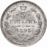 В центре указан номинал «5», ограниченный с обеих сторон шестиконечными звездочками. Над цифрой – Корона Российской империи. Под цифрой номинала — слово "КОПЕЕК". Ниже, расположен декоративный разделитель в виде двух разнонаправленных фигурных линий и стилизованным из точек крестом между ними. Под разделителем — дата выпуска монеты «1893». Под цифрой даты — обозначение монетного двора «С.П.Б.». Вдоль канта, не доходя до короны, изображен венок из лавровой и дубовой ветви, которые в нижней части перевязаны лентой на узел бантом. По окружности канта имеются рельефные элементы, выполненные в виде зубцов.