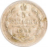 В центре указан номинал «5», ограниченный с обеих сторон шестиконечными звездочками. Над цифрой – Корона Российской империи. Под цифрой номинала — слово "КОПЕЕК". Ниже, расположен декоративный разделитель в виде двух разнонаправленных фигурных линий и стилизованным из точек крестом между ними. Под разделителем — дата выпуска монеты «1893». Под цифрой даты — обозначение монетного двора «С.П.Б.». Вдоль канта, не доходя до короны, изображен венок из лавровой и дубовой ветви, которые в нижней части перевязаны лентой на узел бантом. По окружности канта имеются рельефные элементы, выполненные в виде зубцов.