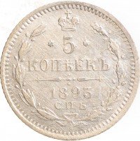 В центре указан номинал «5», ограниченный с обеих сторон шестиконечными звездочками. Над цифрой – Корона Российской империи. Под цифрой номинала — слово "КОПЕЕК". Ниже, расположен декоративный разделитель в виде двух разнонаправленных фигурных линий и стилизованным из точек крестом между ними. Под разделителем — дата выпуска монеты «1893». Под цифрой даты — обозначение монетного двора «С.П.Б.». Вдоль канта, не доходя до короны, изображен венок из лавровой и дубовой ветви, которые в нижней части перевязаны лентой на узел бантом. По окружности канта имеются рельефные элементы, выполненные в виде зубцов.