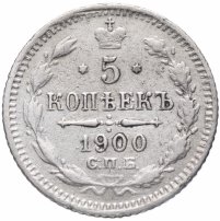 В центре указан номинал «5», ограниченный с обеих сторон звездочками. Над цифрой – Корона Российской империи. Под цифрой номинала — слово "КОПЕЕК". Ниже, расположен декоративный разделитель в виде двух разнонаправленных фигурных линий и стилизованным из точек крестом между ними. Под разделителем — дата выпуска монеты «1900». Под цифрой даты — обозначение монетного двора «С.П.Б.». Вдоль канта, не доходя до короны, изображен венок из лавровой и дубовой ветви, которые в нижней части перевязаны лентой на узел бантом. По окружности канта имеются рельефные элементы, выполненные в виде зубцов.