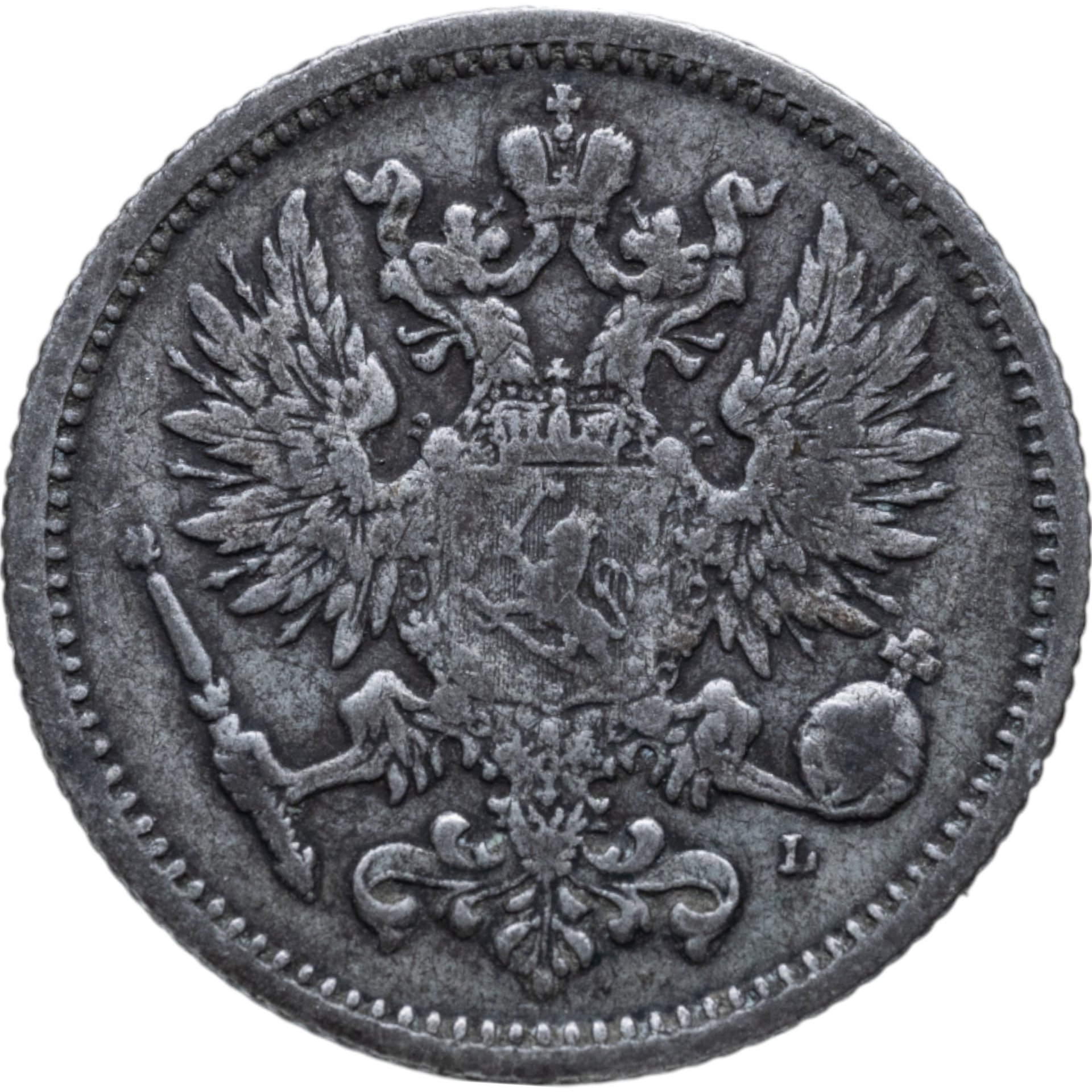 В центре изображён полный Герб Великого княжества Финляндского - двуглавый орёл, головы которого увенчаны двумя коронами, третья, большая корона над ними. Все они соединены орденской лентой ордена Св. Апостола Андрея Первозванного. На груди орла расположен щит с титульным гербом Великого князя Финляндского, увенчанный княжеской короной. Вокруг щита орденская цепь с орденом Св. Апостола Андрея Первозванного. В правой лапе орла – скипетр, в левой – держава. Под левой лапой знак директора Гельсингфосского монетного двора - литера «L», Johan Conrad Lihr (Йохан Конрад Лир). По окружности канта имеются рельефные элементы, выполненные в виде зубцов.