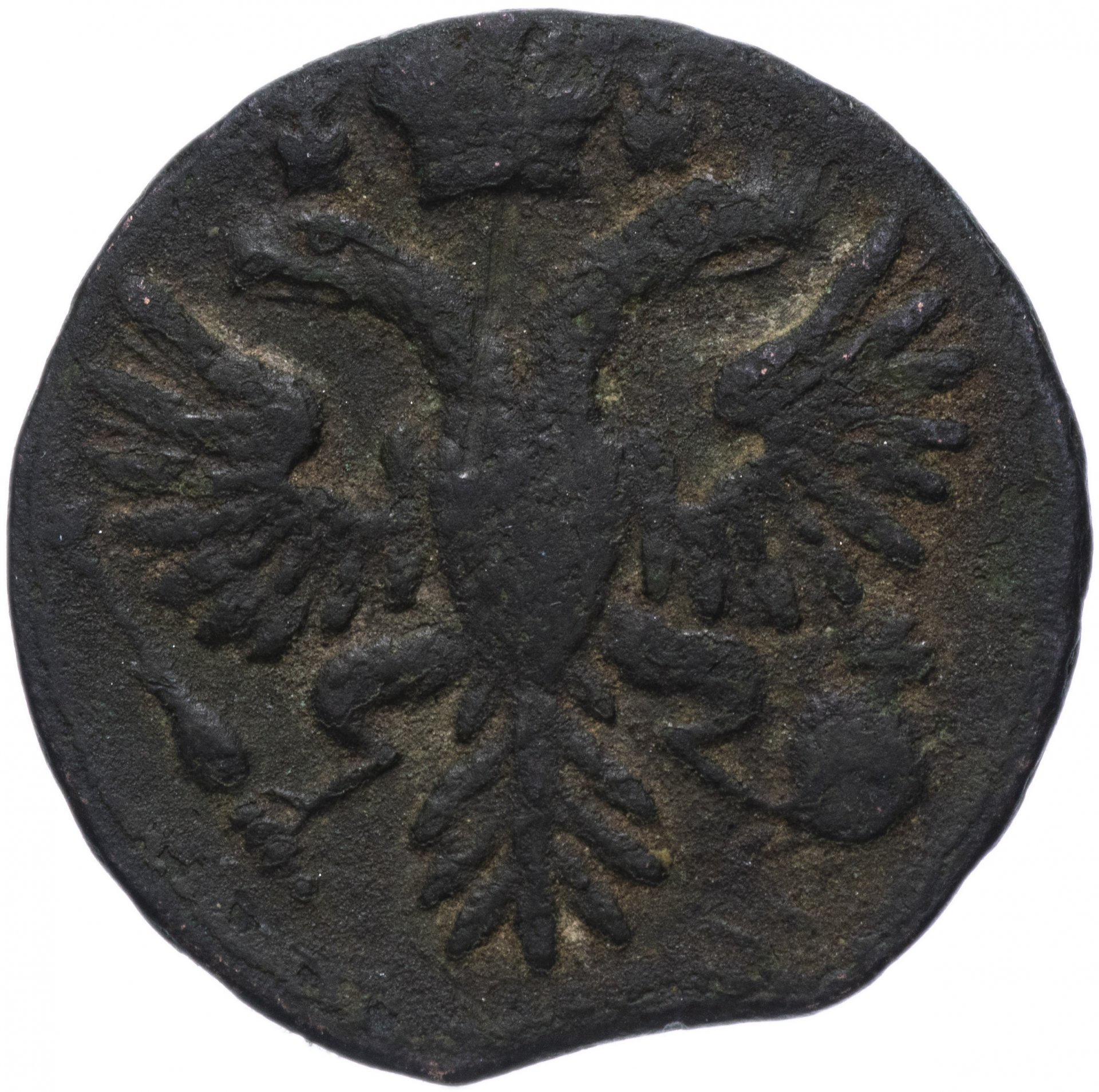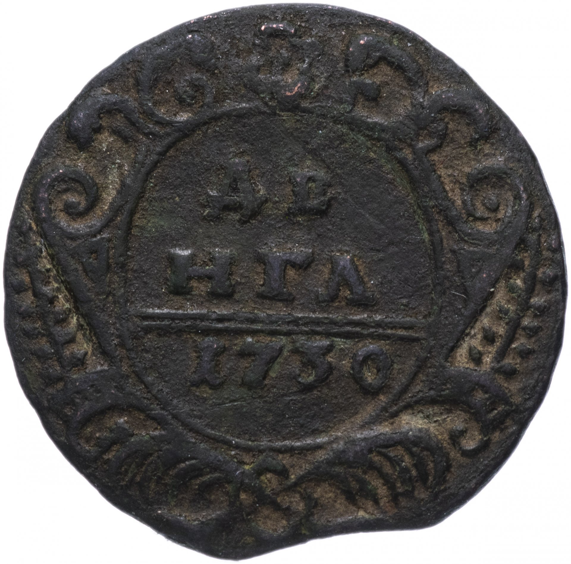 В центре изображён картуш украшенный виньетками, по обеим сторонам две лавровые ветви, сверху - цветочная розетка. Под картушем - две перекрещенные пальмовые ветви с обвязкой (бантом). В картуше надпись в три строки, в которой указан номинал и год выпуска: «ДЕ»│«НГА»│«1730». Между номиналом и годом выпуска две прямые черты.