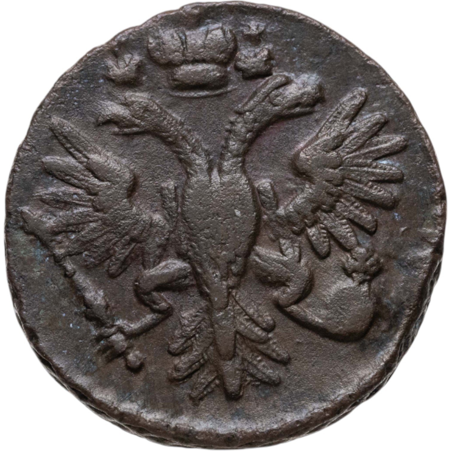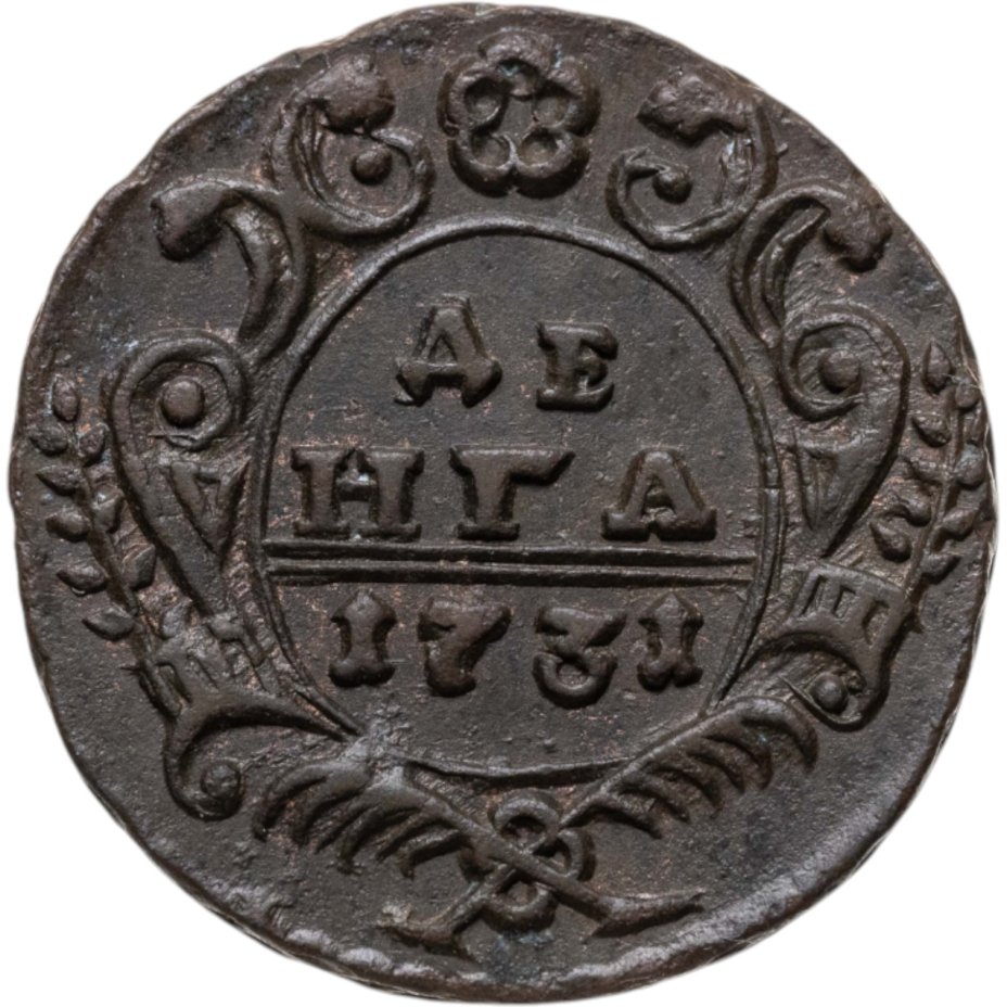 В центре изображён картуш украшенный виньетками, по обеим сторонам две лавровые ветви, сверху - цветочная розетка. Под картушем - две перекрещенные пальмовые ветви с обвязкой (бантом). В картуше надпись в три строки, в которой указан номинал и год выпуска: «ДЕ»│«НГА»│«1731». Между номиналом и годом выпуска две прямые черты.