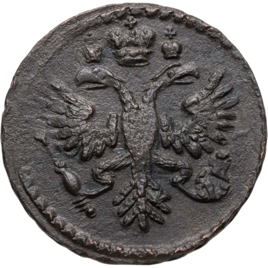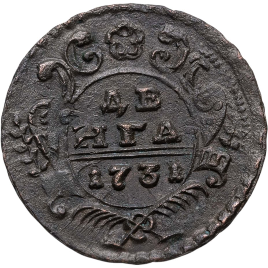 В центре изображён картуш украшенный виньетками, по обеим сторонам две лавровые ветви, сверху - цветочная розетка. Под картушем - две перекрещенные пальмовые ветви с обвязкой (бантом). В картуше надпись в три строки, в которой указан номинал и год выпуска: «ДЕ»│«НГА»│«1731». Между номиналом и годом выпуска две прямые черты.