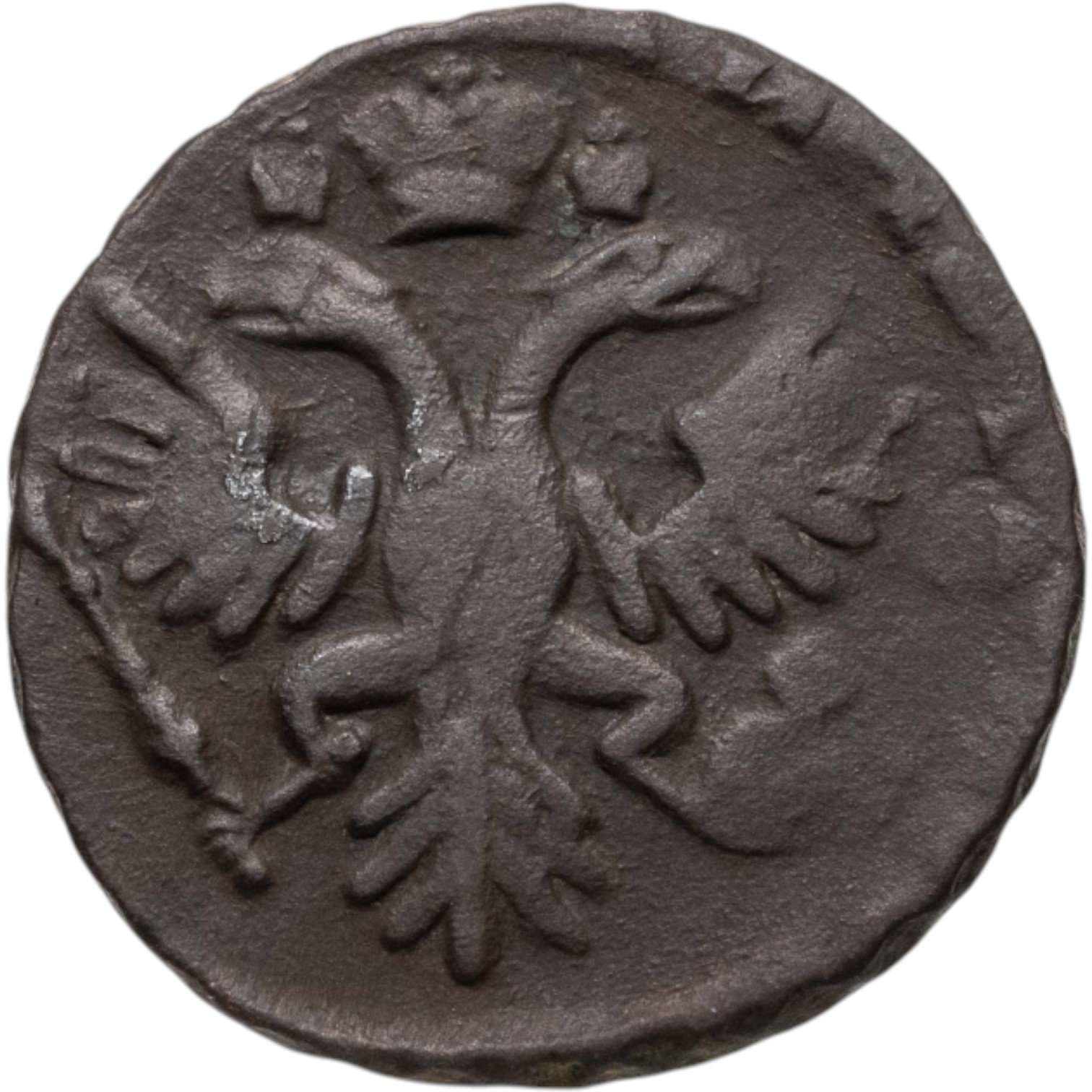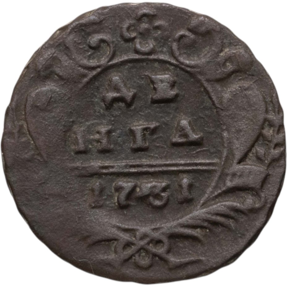 В центре изображён картуш украшенный виньетками, по обеим сторонам две лавровые ветви, сверху - цветочная розетка. Под картушем - две перекрещенные пальмовые ветви с обвязкой (бантом). В картуше надпись в три строки, в которой указан номинал и год выпуска: «ДЕ»│«НГА»│«1731». Между номиналом и годом выпуска две прямые черты.