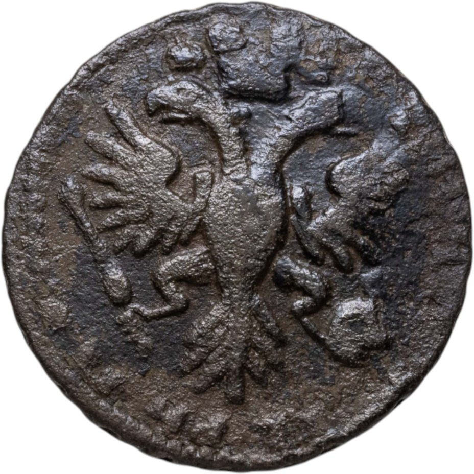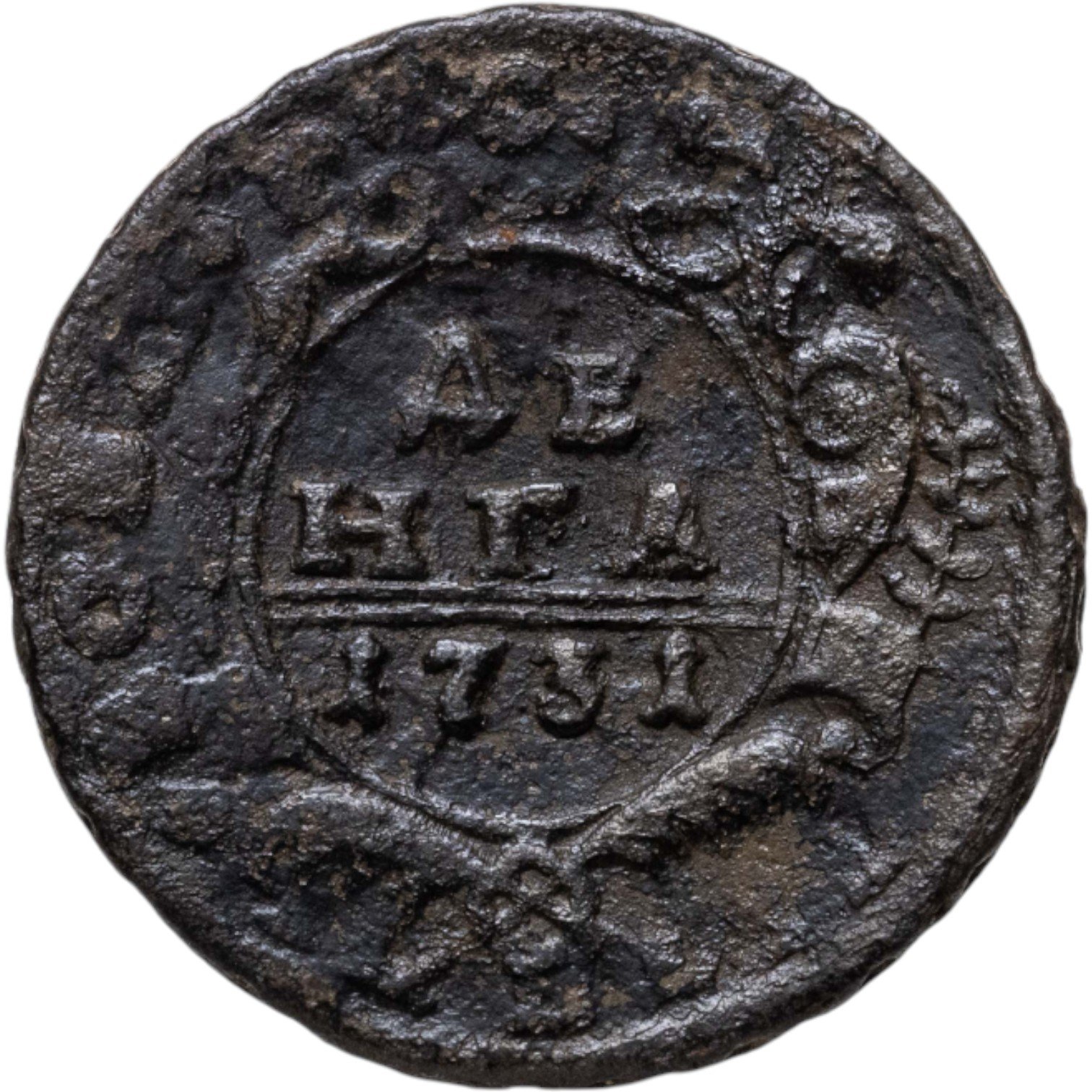 В центре изображён картуш украшенный виньетками, по обеим сторонам две лавровые ветви, сверху - цветочная розетка. Под картушем - две перекрещенные пальмовые ветви с обвязкой (бантом). В картуше надпись в три строки, в которой указан номинал и год выпуска: «ДЕ»│«НГА»│«1731». Между номиналом и годом выпуска две прямые черты.