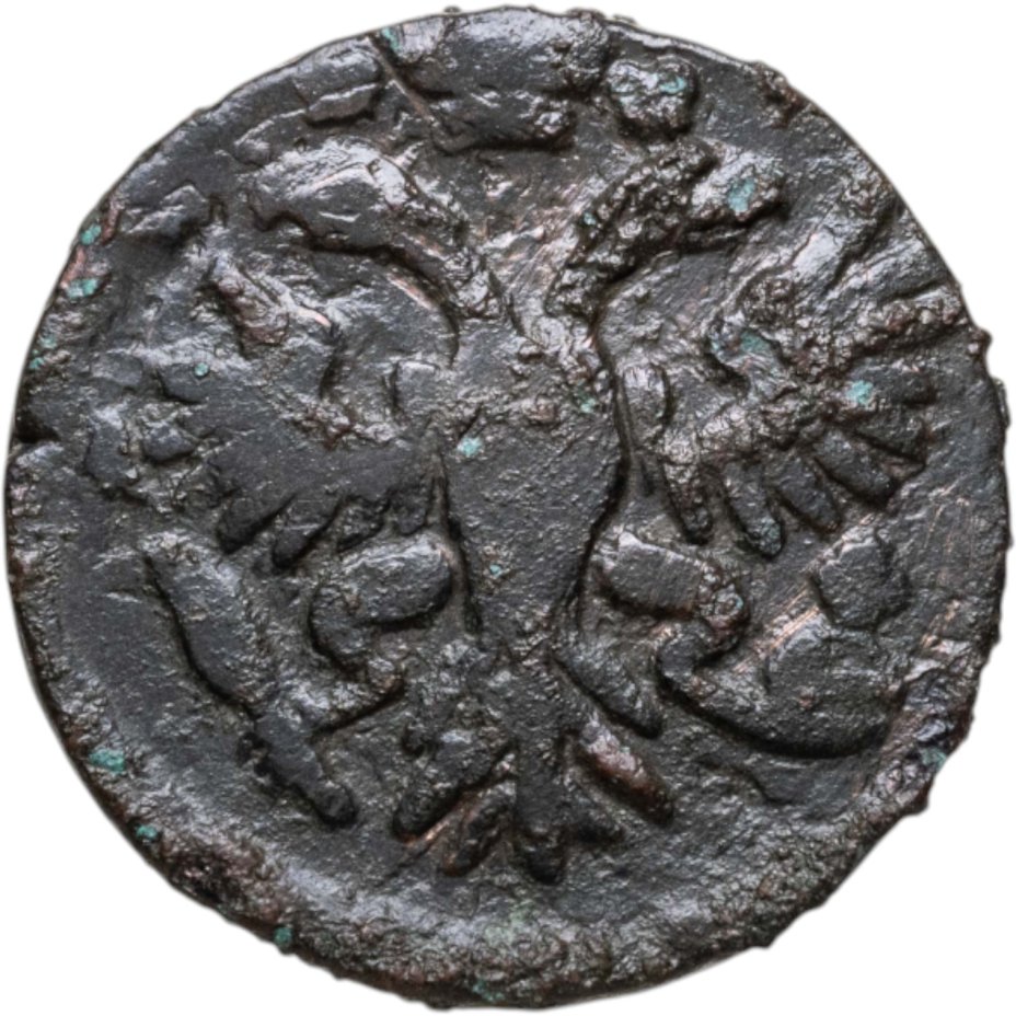 В центре изображён картуш украшенный виньетками, по обеим сторонам две лавровые ветви, сверху - цветочная розетка. Под картушем - две перекрещенные пальмовые ветви с обвязкой (бантом). В картуше надпись в три строки, в которой указан номинал и год выпуска: «ДЕ»│«НГА»│«1731». Между номиналом и годом выпуска две прямые черты.