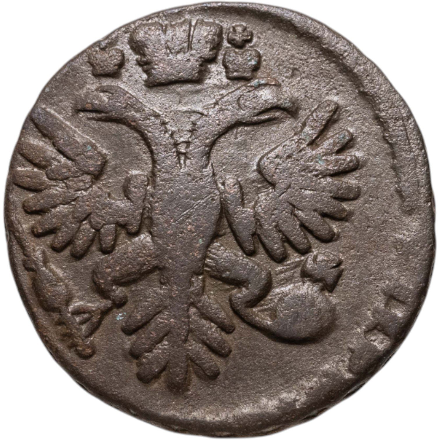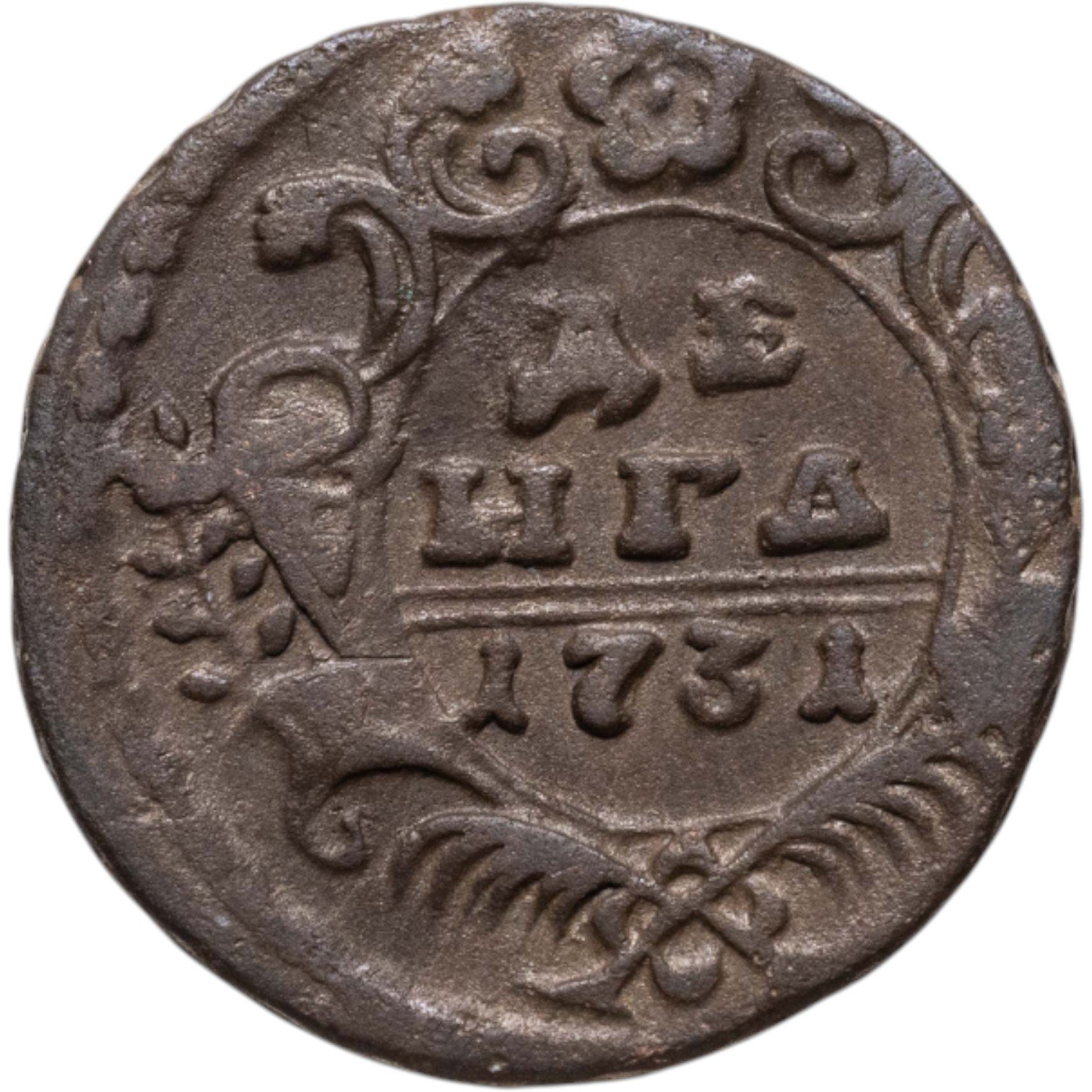 В центре изображён картуш украшенный виньетками, по обеим сторонам две лавровые ветви, сверху - цветочная розетка. Под картушем - две перекрещенные пальмовые ветви с обвязкой (бантом). В картуше надпись в три строки, в которой указан номинал и год выпуска: «ДЕ»│«НГА»│«1731». Между номиналом и годом выпуска две прямые черты.