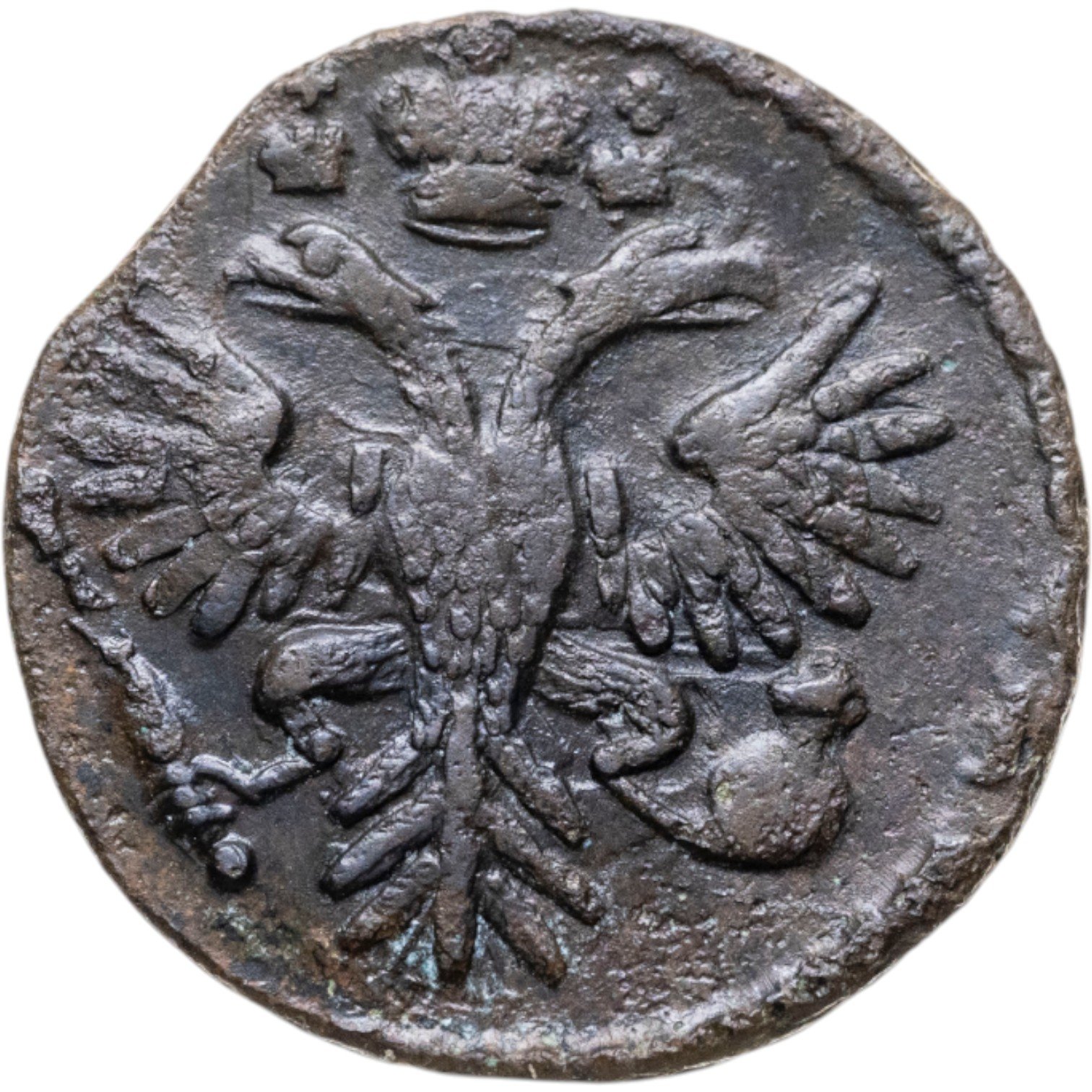 В центре изображён картуш украшенный виньетками, по обеим сторонам две лавровые ветви, сверху - цветочная розетка. Под картушем - две перекрещенные пальмовые ветви с обвязкой (бантом). В картуше надпись в три строки, в которой указан номинал и год выпуска: «ДЕ»│«НГА»│«1731». Между номиналом и годом выпуска две прямые черты.