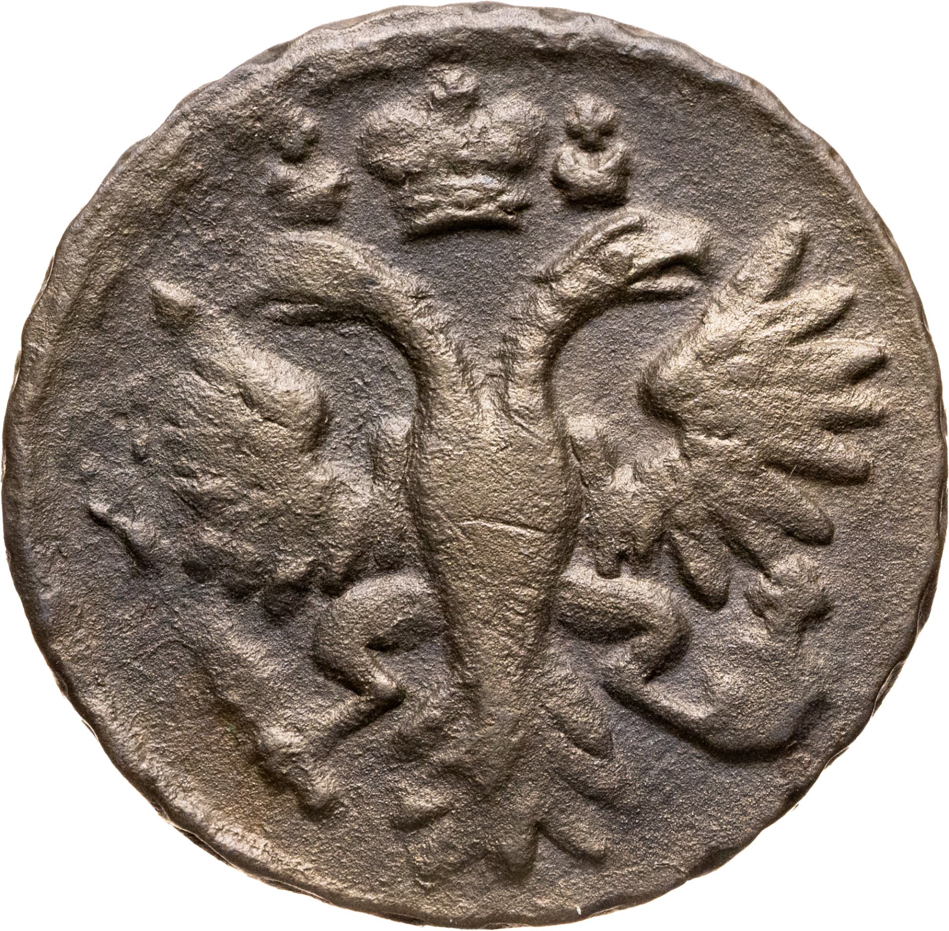Малахитовая патина. Хорошо видно перечекан, остатки слова Пётр.