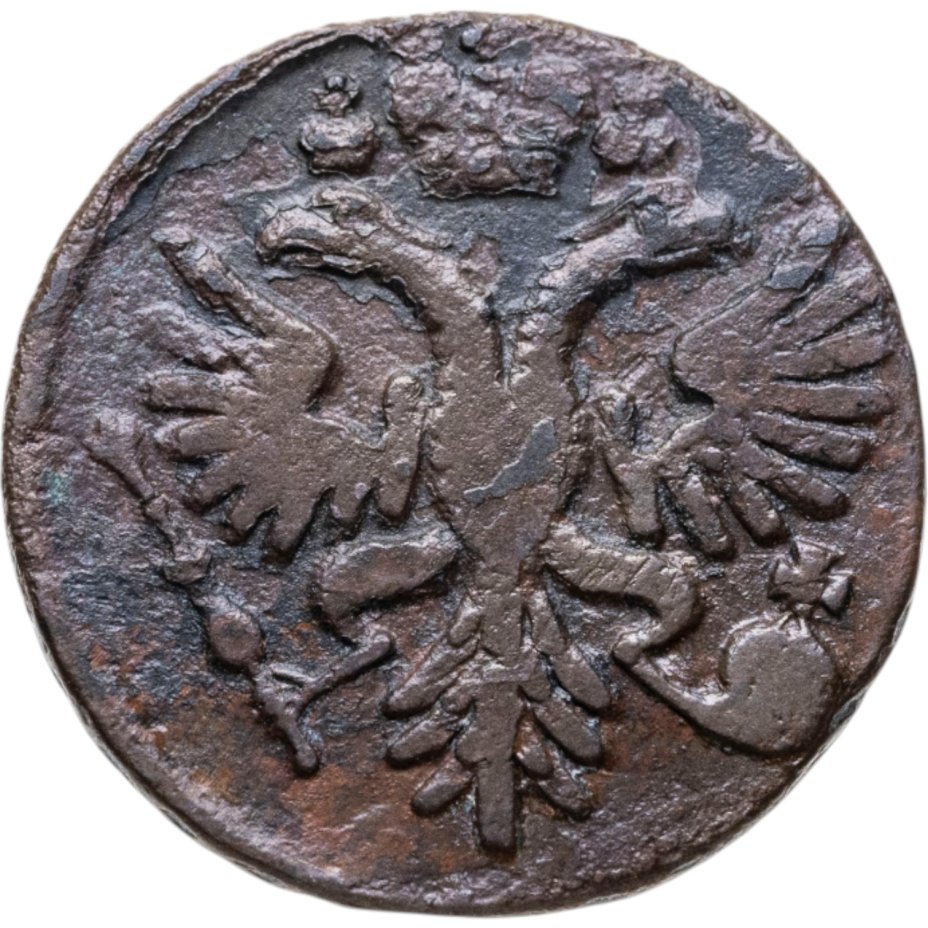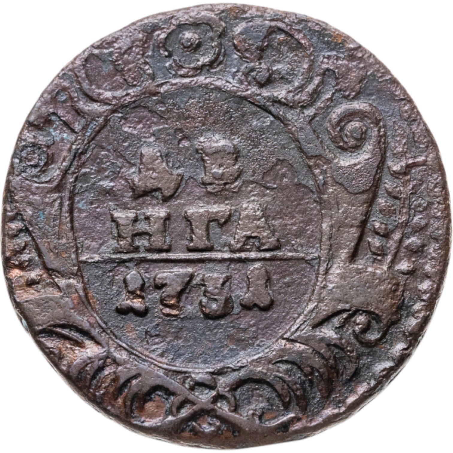 В центре изображён картуш украшенный виньетками, по обеим сторонам две лавровые ветви, сверху - цветочная розетка. Под картушем - две перекрещенные пальмовые ветви с обвязкой (бантом). В картуше надпись в три строки, в которой указан номинал и год выпуска: «ДЕ»│«НГА»│«1731». Между номиналом и годом выпуска одна прямая черта.