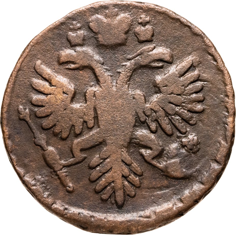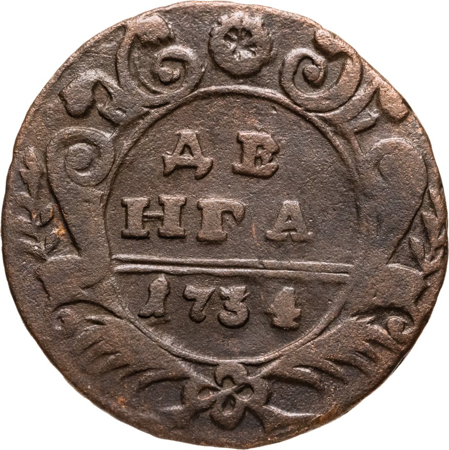 В центре изображён картуш украшенный виньетками, по обеим сторонам две лавровые ветви, сверху - цветочная розетка. Под картушем - две перекрещенные пальмовые ветви с обвязкой (бантом). В картуше надпись в три строки, в которой указан номинал и год выпуска: «ДЕ»│«НГА»│«1734». Между номиналом и годом выпуска две прямые черты.