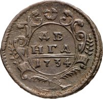денга 1734 над годом две черты, перечекан из копейки Петра I