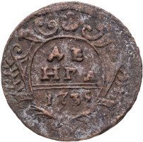 В центре изображён картуш украшенный виньетками, по обеим сторонам две лавровые ветви, сверху - цветочная розетка. Под картушем - две перекрещенные пальмовые ветви с обвязкой (бантом). В картуше надпись в три строки, в которой указан номинал и год выпуска: «ДЕ»│«НГА»│«1735». Между номиналом и годом выпуска две прямые черты.