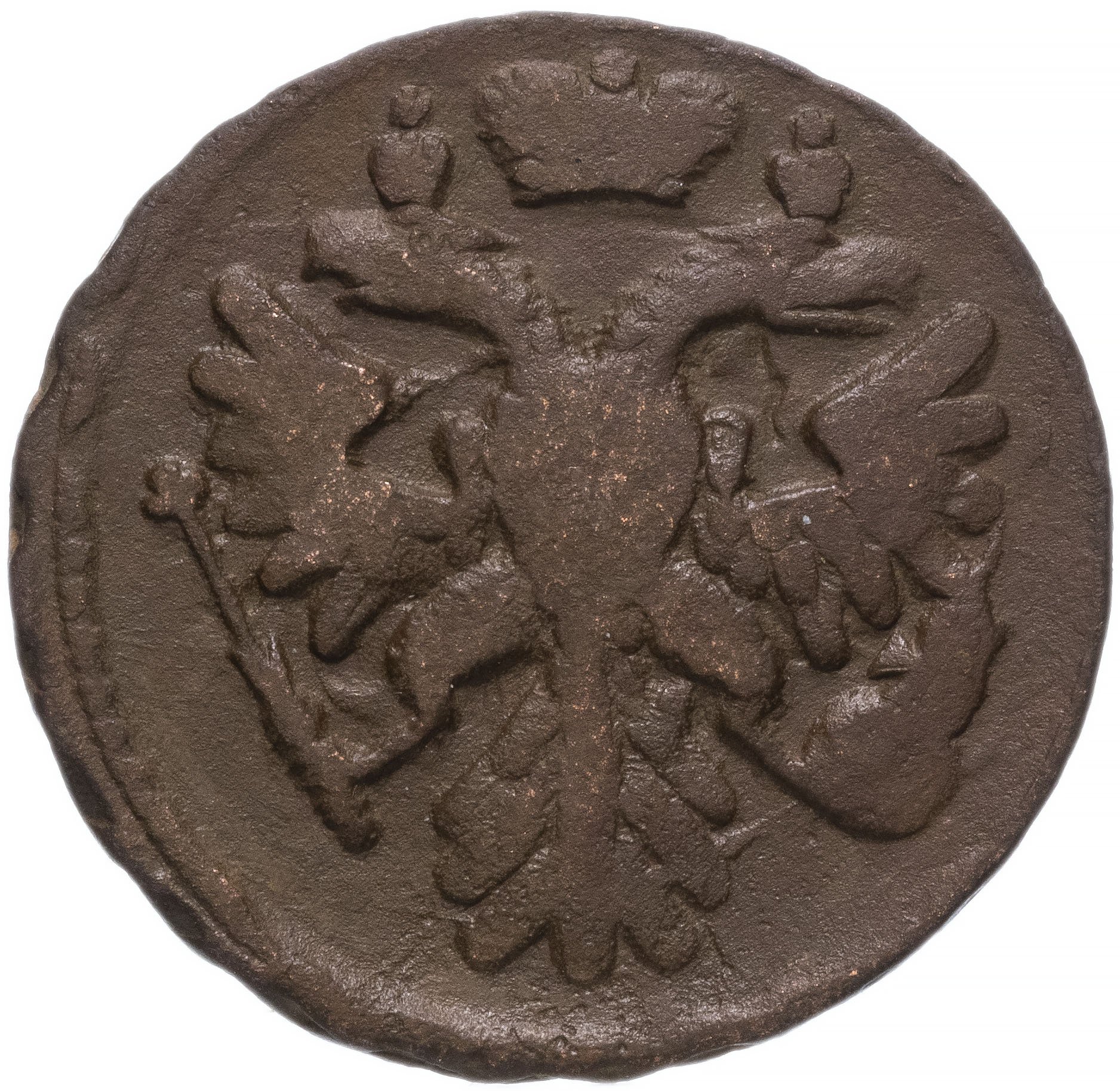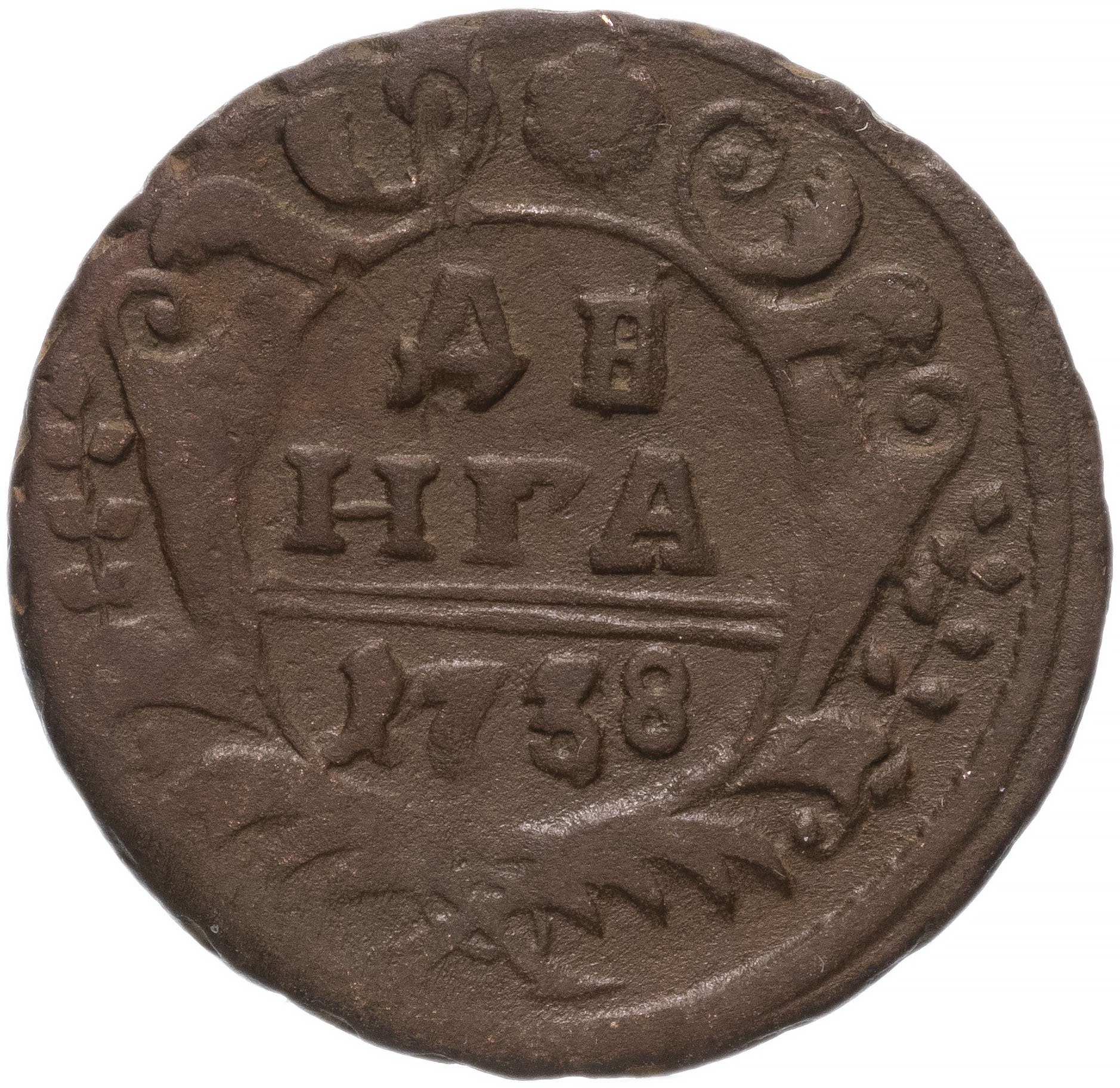 В центре изображён картуш украшенный виньетками, по обеим сторонам две лавровые ветви, сверху - цветочная розетка. Под картушем - две перекрещенные пальмовые ветви с обвязкой (бантом). В картуше надпись в три строки, в которой указан номинал и год выпуска: «ДЕ»│«НГА»│«1738». Между номиналом и годом выпуска две прямые черты.